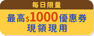 活動方式:活動期間內點選頁面「領券」按鈕(需先登入),該面額優惠券將自動歸戶,面額以實際提供為準,依各門檻限制使用,需於指定期限內使用完畢。每會員帳號每日各優惠券限領乙張,數量有限,送完為止。