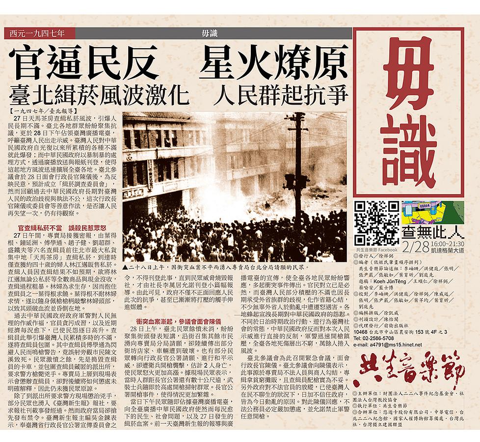 | 簡介 / | 毋識: 2018共生音樂節專冊:以報紙形式呈現二二八事件、國民黨威權統治、轉型正義的相關討論,一方面凸顯事件日常感,一方面讓更多人有興趣閱讀。二二八事件的導火線、基隆 |