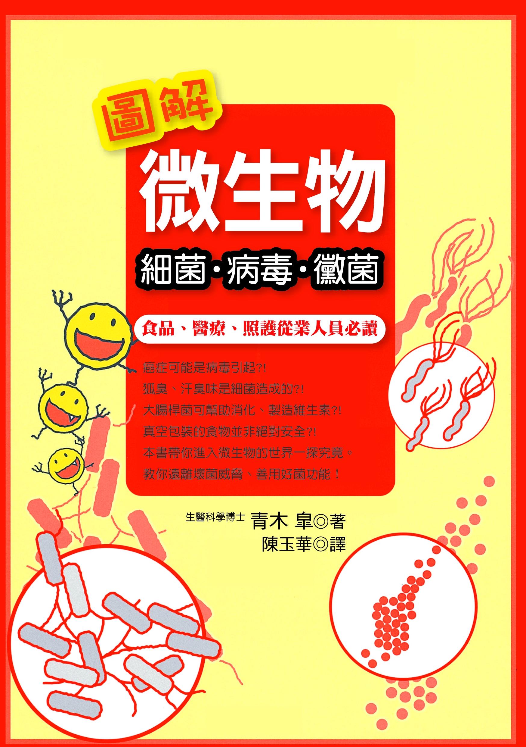 | 簡介 / | 圖解微生物: 細菌. 病毒. 黴菌:食品、醫療與老人照護等從業人員必讀!癌症可能是病毒引起?!汗臭味是細菌造成的?!大腸桿菌可幫助消化、製造維生素?!真空包裝的食物並非絕對 |