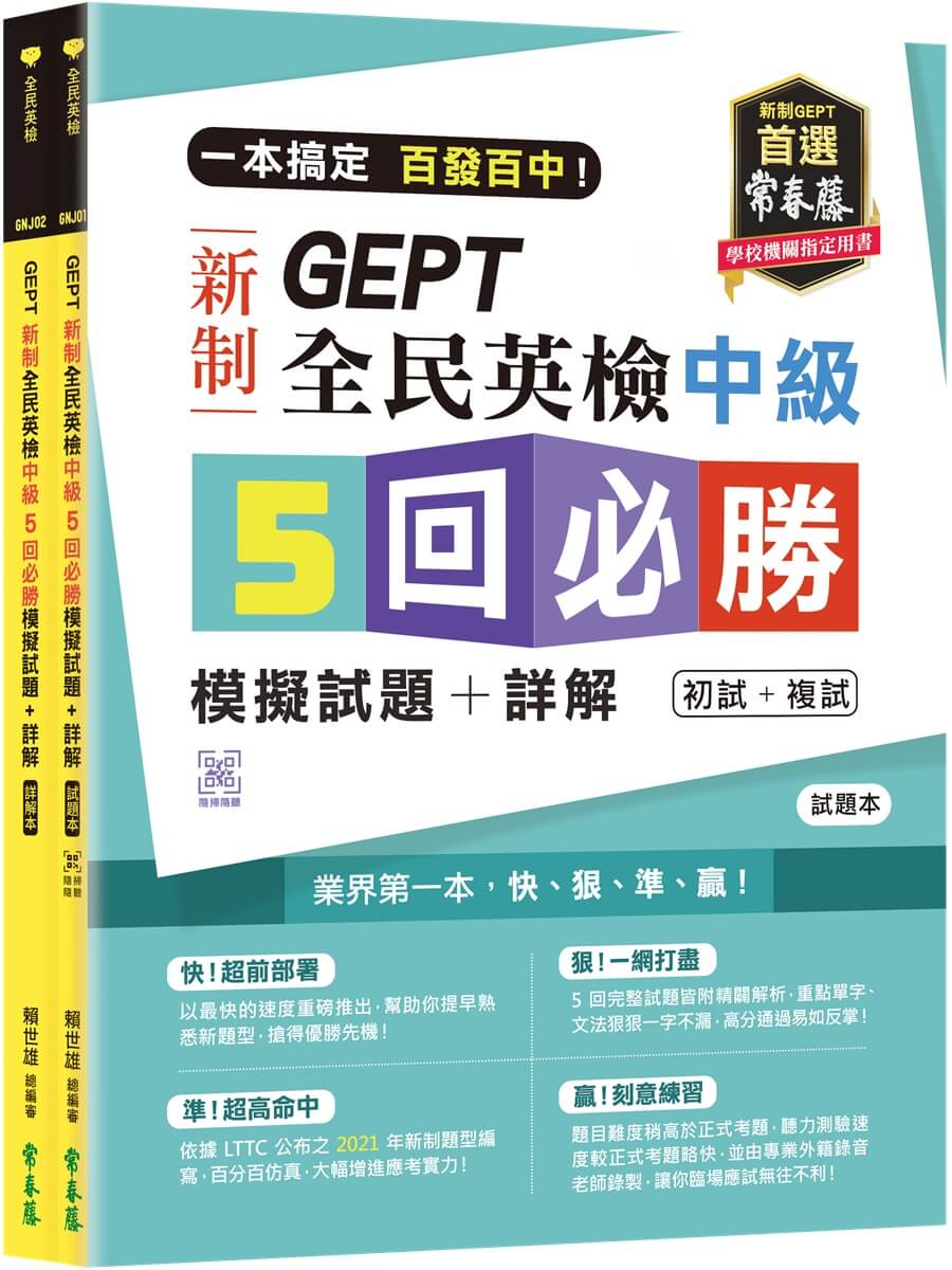 書名 / | 一本搞定百發百中! GEPT新制全民英檢中級5回必勝模擬試題+詳解(初試+複試): 試題本+詳解本 (附QR Code線上音檔 2冊合售) |