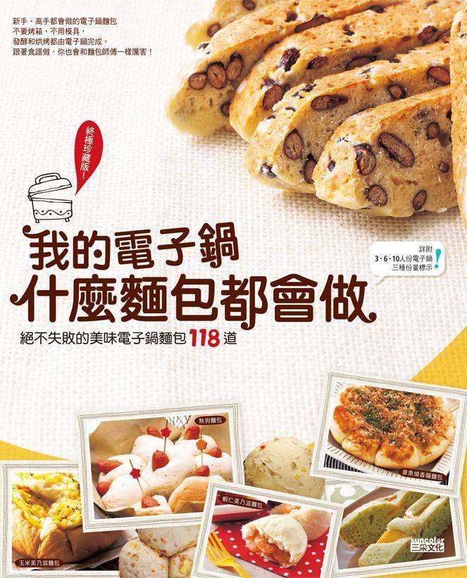 | 簡介 / | 我的電子鍋什麼麵包都會做:終極珍藏版!我的電子鍋什麼麵包都會做絕不失敗的美味電子鍋麵包118道新手、高手都會做的電子鍋麵包不要烤箱、不用模具,發酵和烘烤都由電子鍋 |