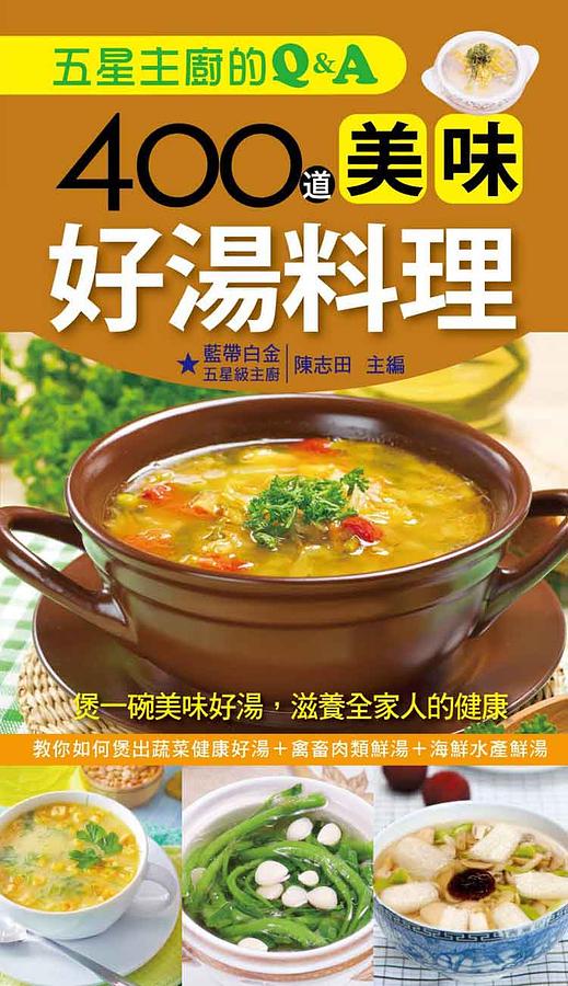 | 簡介 / | 五星主廚的Q&A: 400道美味好湯料理:煲一碗美味好湯,滋養全家人的健康 教你如何煲出美味好湯+蔬菜健康好湯+禽畜肉類鮮湯+海鮮水產鮮湯 400道養顏健體的美味好湯,400 |