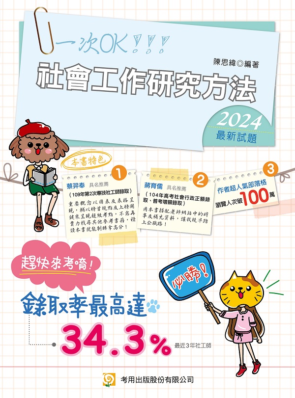 內容簡介 蔡羿奉 具名推薦(109年第2次專技社工師錄取) 重要概念以圖表及表格呈現,輔以榜首提點及上榜關鍵來呈現超級考點,不需再費力找尋其他參考書籍,精讀本書就能制勝拿高分! 蔣育儒 具名推薦(104年高考社會行政正額錄取、普考增額錄取) 用本書搭配老師網站中的時事及補充資料,讓我提早踏上公職路! 作者超人氣部落格 瀏覽人次破100萬 最近3年社工師+高普特考 錄取率高達34.3% 讀書方法+精準重點→不浪費時間=記憶背誦更簡單!一次OK! 社工系學生普遍認為「社會工作研究方法」內容涉及方法論及研究設計,很難準備,但只要這科分數能夠異軍突起,就是掌握勝利之鑰。 本書編排,完全從考生的角度著手,適時的加入圖表,提升邏輯架構之建立,並以最具系統化的整理與分析,建立完整的架構;內容的整理,清晰有條理,再加上適當的案例輔助,強化閱讀記憶,考場得分高下立見,榮登公職金榜。