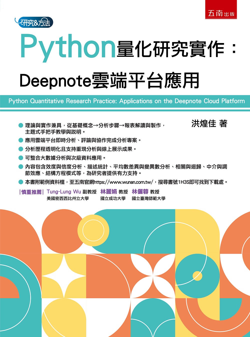 本書旨在引導讀者從概念到實作,系統化學習量化研究的統計分析技術。內容整合常用統計方法,分為「基礎概念、分析步驟、報表解讀與製作」三大部分,並附有練習題加強實務能力。所有範例數據與程式碼均可從五南圖書官網下載,幫助讀者快速上手,提升學習效率。
