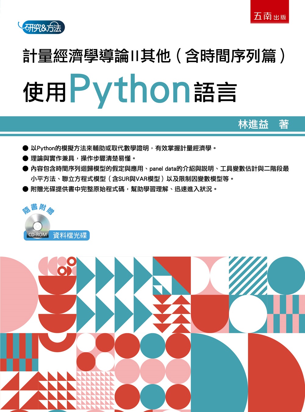 《計導II》可以分成三大部分,其中第一部分包括第1∼5章,內容主要敘述「時間序列迴歸模型」的假定、內容與估計等。第二部分包括第6∼7章,其是有關於panel data的介紹與說明。第8∼10章則屬於第三部分,其內容含工具變數估計與二階段最小平方法、聯立方程式模型(含SUR與VAR模型)以及限制因變數模型。無法避免地,《計導II》的第三部分有使用一些基本的矩陣代數操作,不過有關於後者,《計導II》仍有附錄加以補充說明。與一些進階的書籍如Baltagi(2008, 2021)、Verbeek(2017)、Greene(2003)或Hansen(2022)等書籍(上述書籍普遍使用矩陣代數操作)比較,《計導II》的內容仍偏向於屬於導論型的書籍,讀者應該能掌握。當然,比較麻煩的還是Python的操作,筆者只能建議:多實際操作,多利用網路查詢不懂或不熟悉的部分,今天不學,未來還是不會。於當代,似乎多學習程式語言應該是有利的。