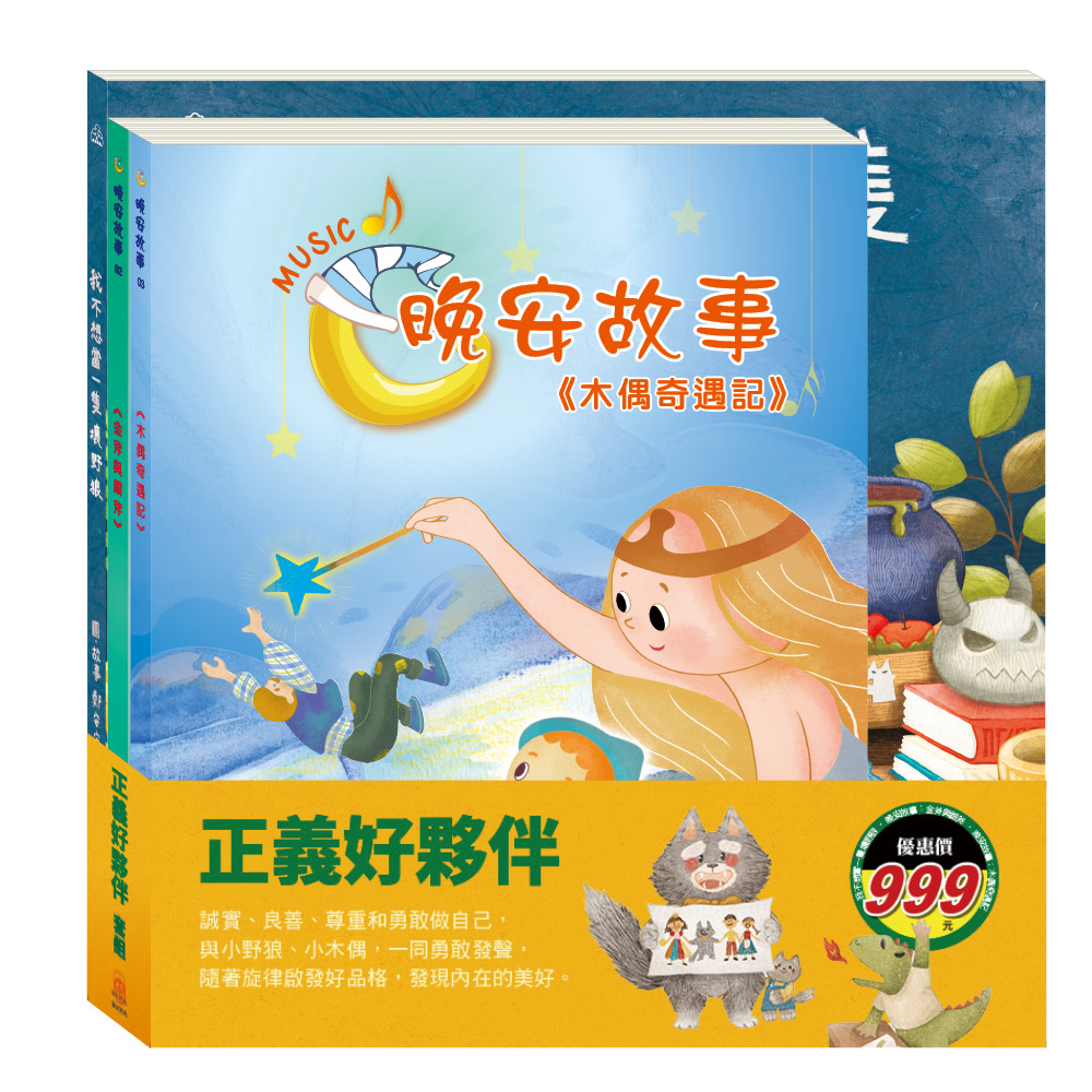 內容簡介 正義好夥伴 套組 誠實、良善、尊重和勇敢做自己,與小野狼、小木偶、小男孩,一同勇敢發聲,隨著旋律啟發好品格,發現內在的美好。【晚安故事】系列:■ 用童話啟發好品格 -- 精選寓意和趣味兼具的童話故事,潛移默化生活中的大道理,影響孩子一輩子的品格教育。親子睡前的親密對話,陪伴孩子在成長道路上,更堅定原本內心良善的信念。■ 用音樂啟動好腦力 -- 搭配古典音樂豐富的旋律,快慢有序的節奏,刺激聽覺神經生長與發育。音樂故事劇場身歷其境的感受,滿足幼兒的全腦發展刺激,是陪伴孩子的最佳床邊音樂故事!我不想當一隻壞野狼 出生在野狼家族的小野狼班班,必須去「壞壞森林小學」學習成為一個大家都害怕的狠角色,可是班班卻一點都不快樂……他不想要嚇人,也不想要調配魔藥。於是,他決定展開探索,找到內心的方向,然後鼓起勇氣大聲說:「我不想要當一隻壞野狼」! 【尊重傾聽讓愛陪伴,發現孩子內在的美好】 《我不想當一隻壞野狼》是促進家長與孩子溝通討論的好幫手。當書中小野狼遇到的煩惱,一同看故事的家長可以問問孩子「如果是你,你會怎麼做?」、「你會希望我怎麼做?」,藉著討論進而理解與尊重孩子的想法,也告知正確的觀念。讓我們跟孩子一起讀繪本,增進親子間的溝通與感情吧! 晚安故事:金斧與銀斧 ☆核心品格:〖誠實〗 ☆搭配樂曲:布拉姆斯〈第一號小夜曲〉 樵夫阿金的斧頭不小心掉到「仙女湖」裡了! 因為他不受利誘的誠實品格,讓仙女不僅幫他把斧頭撿了回來,還送給他兩把珍貴的金斧頭和銀斧頭作為獎勵。 另一個樵夫阿銀在旁邊偷看到了這一幕,也好想拿到那兩把珍貴的斧頭…… 晚安故事:木偶奇遇記 ☆核心品格:〖說謊的可怕〗 ☆搭配樂曲:馬勒〈第三號交響曲〉 仙女用魔法讓薛貝特爺爺的小木偶皮諾丘會動、會說話,讓爺爺開心極了! 但是皮諾丘在上學的途中,遇到了好多新鮮有趣的事情,一不小心就把「乖乖去上學」這個承諾忘得一乾二淨,還對來救他的仙女說謊,究竟會發生什麼可怕的事呢?