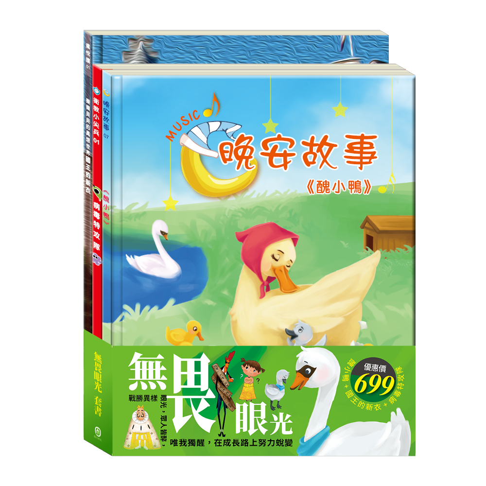 內容簡介 無畏眼光 套組戰勝異樣眼光,眾人皆醉,唯我獨醒,在成長路上努力蛻變 三書出擊,讓您無所畏懼【晚安故事】特色■用童話啟發好品格 -- 精選寓意和趣味兼具的童話故事,潛移默化生活中的大道理,影響孩子一輩子的品格教育。親子睡前的親密對話,陪伴孩子在成長道路上,更堅定原本內心良善的信念。■用音樂啟動好腦力 -- 搭配古典音樂豐富的旋律,快慢有序的節奏,刺激聽覺神經生長與發育。音樂故事劇場身歷其境的感受,滿足幼兒的全腦發展刺激,是陪伴孩子的最佳床邊音樂故事!【樂樂貝貝的異想世界】特色■全新角度切入經典童話,開啟親子同步成長的新視野不僅以感恩、知足、自信、堅持四大核心品格教育為理念出發,在「閱讀」的基礎上,更進一步強調「悅讀」。十二本的經典童話故事,一對現代的小兄妹樂樂和貝貝,穿越時空進入故事,和故事裡的人物一起探險,並將領悟到的道理實踐在現實生活中。現在就讓可愛又活潑的兄妹倆,帶領聆聽的孩子一起馳騁於繽紛的異世界吧!【衛教小尖兵】特色【孩子不用怕!跟特攻隊一起出任務,擊潰病毒大軍!】2020年新冠病毒疫情來勢洶洶,原本不戴口罩的人改變了觀念,人們見面打招呼開始避免身體的接觸,防疫專家更一再強調民眾勤洗手的貫徹執行。但其實在此之前,面對流感、腸病毒等層出不窮的各種病毒,孩子們的衛生習慣養成,早已成為家長和老師每日的功課。但是了解病毒、養成好習慣固然重要,孩子最強健的免疫力是來自父母的陪伴,和保持快樂開朗。有鑒於此,我們特別企劃這本病毒防疫的衛教圖書。繪者本身就有一位幼齡的女兒,從平日小女兒和玩偶們玩扮家家酒的互動中,得到了「病毒特攻隊」故事和角色的靈感。《醜小鴨》 ☆核心品格:〖友愛與接納〗 ☆搭配樂曲:莫札特〈第二十四號交響曲〉 鴨媽媽生下一隻「醜小鴨」,兄弟姐妹們都不喜歡他。 在河邊散心的醜小鴨被大水沖走,找不到回家的路,只好到處流浪。 流浪在外的醜小鴨漸漸長大,並且在某一天,發現了一件驚人的事實…… 《國王的新衣》 〖核心品格:自信〗 〜認識自己的本質,全面接納自我〜 哇!一年一度的國慶遊行就要開始了,國王卻怎麼也找不到令他滿意的新衣服。還好,有兩位自告奮勇的裁縫師要幫國王做聰明人才看得見的神奇新衣! 大家都好怕自己看不見那件衣服,但樂樂、貝貝卻發現有些人明明看不到那件衣服,卻好像一點也不怕被別人當成傻瓜,這是怎麼一回事啊? 《病毒特攻隊》 孩子不用怕!跟特攻隊一起出任務,擊潰病毒大軍! 點點、兔寶和小狐狸是好朋友,常常一起出門去玩。有一天,三人又一起出門玩耍。 「奇怪,今天是星期六,為什麼外面都沒人啊?」兔寶好奇地問。 點點說:「聽說最近有一種很恐怖的病毒,讓很多人都生病了。」 兔寶及小狐狸異口同聲地說:「真的太恐怖了,我們還是趕快回家吧!」