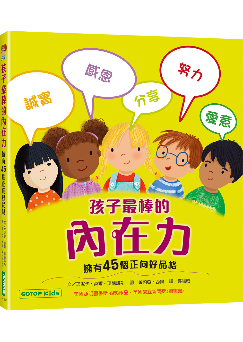 內容簡介 45個關鍵的正向好品格, 以有效且實用的生活事件, 啟發孩子培養積極、樂觀的態度。 搭配小小的提問,幫助孩子探索自己的想法。 從中建立良好的「成長型思維」心智能力。 能夠提升自我價值感,擁有自信快樂的人生。 ▍ 專業推薦 「培養孩子健全的品格,才能在瞬息萬變的世代中保持卓越的適應力與競爭力。」 —胡展誥|諮商心理師 「家長的教導是培養孩子好品格的根本,透過繪本的引導,建立強大的內在能力。」 —魏瑋志(澤爸) |親職教育講師 ▍ 關於本書 一本囊括了45種品格力量的故事繪本 情境故事 x 行為引導 x 反思己身 X 加強動機 透過故事中的行為引導讓孩子簡單落實品格精神 成為一個擁有強大內在力的自信孩子 你知道我們都有什麼樣的正向品格和價值觀嗎? 有些你覺得微不足道的正向品格,對某些人來說可能很重要。 無論你覺得什麼樣的品德能力對生活很重要, 它們都是你的價值觀,它們全都屬於你! 讓我們去發掘數也數不完的無窮內在力,包括:誠實、感恩、分享、努力等。 《孩子最棒的內在力:擁有45個正向好品格》是一本令人愉快的書, 它教會孩子們獨特內在力的重要性,找出自己的美好特質。 孩子們將學習各種價值觀,並且尊重接受與其他人不同的價值觀。 每個人重視的價值都不同,有的人重視團隊合作,有的人則喜歡簡單,有的人喜歡敞開心胸,有的人認為耐心很重要。不論你喜歡的價值是什麼,那都是屬於你的內在力! 在這本可愛的書中,每一頁由一個孩子介紹對他╱她而言最重要的價值觀或美德,也許是同情心、好奇心或責任感等,一頁介紹一種品格,一頁講述一個小故事,讓小讀者們一起來探索每個人不同的價值觀以及內在所需要重視的美德,同時也啟發孩子探索自己的個性與尊重他人,一起思考自己能為這個世界帶來什麼樣良善的影響! 以孩子的日常生活經驗為出發點,每一頁都是一則小故事、一個小情境,透過事情的發生與行為影響相互連接的結果,整個事件發揮了無形的精神價值,藉機引導孩子看完故事後反思自己過去的舊經驗,是否也有過同樣的行為感受與處理的方式。 ▍ 得獎紀錄 美國照明圖書獎銀獎作品(2023 Illumination Book Awards Silver Medalist, Education) 美國獨立新聞獎(圖畫書)(2023 Independent Press Awards Winner) ▍ 本書特色 1.以兒童熟悉的日常生活經驗為故事情境場景。 2.以淺顯易懂的情境故事闡明品格的精神價值。 3.故事的行為引導孩子如何正確落實內在品格。 4.文末的提問能讓孩子自我反思舊經驗的行為。 5.反思的回饋可增強日後展現良好行為的動機。 ◎適讀年齡:文字附注音,適合3-6歲親子共讀,6歲以上可自行閱讀。