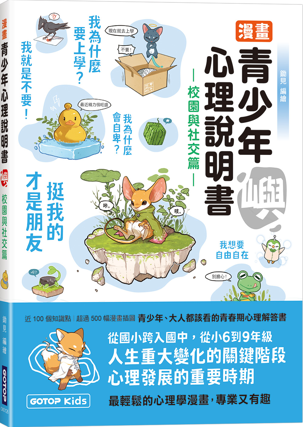 內容簡介 史上第一本,近100個知識點、超過500幅漫畫插圖, 青少年、大人都該看的青春期心理解答書 從國小跨入國中,從小6到9年級 人生重大變化的關鍵階段,心理發展的重要時期 最輕鬆的心理學漫畫,專業又有趣 青少年的心理健康越來越受到重視, 因為它會對少男少女的成長產生重要影響。 面對青春期的成長變化、人際關係、學業壓力…等, 不僅青少年自身會感到恐懼和焦慮, 父母也同樣感到疑惑或束手無策。 這些疑問,只要了解、學習相關知識, 就能得到答案。 為了讓父母和孩子都能輕鬆理解青少年心理學知識, 作者精心編繪了這套適合青少年與家長觀看的心理學漫畫圖書。 《漫畫青少年心理說明書》。 「在本書中,關注孩子進入青春期後心理狀態的變化,以及在學校的情況, 包括:我為什麼要上學?不喜歡老師,怎麼辦? 每次考試前都很緊張怎麼辦?怎麼調整心態面對考試名次? 該如何與朋友相處?引導青少年如何正確認識和處理學業競爭, 如何排解壓力,如何解決人際交往的常見問題,包括如何應對校園霸凌。」 將專業知識融會到日常生活場景中,更容易理解。」 每個跨頁就是一個主題,適合輕鬆寫意的閱讀方式。 每個章節都有小故事,按照章節順序閱讀將更能投入其中。 青少年必須了解自己, 想跟少男、少女相處, 爸媽也需了解青少年的改變。 【漫畫青少年心理說明書】全系列共兩冊 漫畫青少年心理說明書--島(自我與家庭篇) 漫畫青少年心理說明書--嶼(校園與社交篇)(本書) 提升學習力.社交力.積極力.自信力 尋求自主、自我認同、走出家庭, 開始建立成熟的社交人際關係。