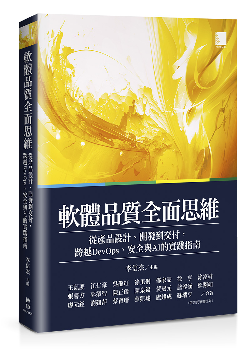 作者介紹 李信杰 主編 現任國立成功大學計中 資訊工程學系副教授,亦為全球最熱門開源測試軟體Selenium IDE V3、Katalon Recorder與Qualys Recorder原型創造者,目前國際上超過80萬名軟體測試人員受惠。 李教授著有100餘篇國內外期刊與會議論文、獲得10餘項最佳論文獎,並擔任100餘項國內外學術服務職務。李教授熱愛軟體工程實務型研究,著迷於鑽研科學化的軟體測試方法。 合著者 CH01 ▷ 廖元鈺 CH02 ▷ 鄒翔如 CH03 ▷ 凃里俐 蘇瑞亨 吳龍紅 蔡育珊 劉建萍 張馨方 詹淳涵 涂富祥《叡揚資訊》 陳泉錫《前財稅資訊中心主任》 CH04 ▷ 江仁豪《OnedaySoftware軟體品質社群創辦人》 CH05 ▷ 陳正瑋《DevOps Taiwan Community & DevOpsDays Taipei Co-organizer》 CH06 ▷ 盧建成《靖本行策 CPHT》 CH07 ▷ 郭榮智 王凱慶《中華資安國際股份有限公司》 CH08 ▷ 黃冠元《技術部落格Complete Think》 CH09 ▷ 郁家豪《Appier沛星互動科技股份有限公司》 CH10 ▷ 蔡凱翔 徐亨《趨勢科技》