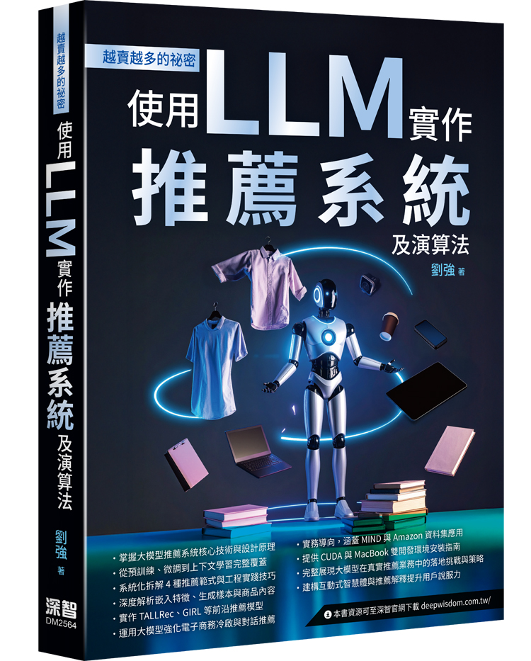 內容簡介 https: www.youtube.com watch?v=BxK3wmq4kWw ►掌握大模型推薦系統核心技術與設計原理 ►從預訓練、微調到上下文學習完整覆蓋 ►系統化拆解4種推薦範式與工程實踐技巧 ►深度解析嵌入特徵、生成樣本與商品內容 ►實作TALLRec、GIRL等前沿推薦模型 ►運用大模型強化電子商務冷啟與對話推薦 ►實務導向,涵蓋MIND與Amazon資料集應用 ►提供CUDA與MacBook雙開發環境安裝指南 ►完整展現大模型在真實推薦業務中的落地挑戰與策略 ►建構互動式智慧體與推薦解釋提升用戶說服力 本書系統性解析大模型如何重塑推薦系統架構,全面涵蓋預訓練、微調、上下文學習等核心技術,並以實戰角度帶領讀者進行實作與部署。透過MIND、Amazon等主流資料集,詳細展示從資料準備、開發環境建置到模型推理的完整流程。內容涵蓋嵌入特徵生成、冷啟推薦、推薦解釋、互動式推薦等熱門應用,並實作TALLRec、GIRL、LLMRank等前沿案例。進階章節更涵蓋大模型在真實業務中的部署策略、ROI 分析與工程最佳化,幫助開發者將技術真正落地。適合大專院校、AI 工程師及產業實務人員深入學習大模型推薦技術的首選指南。