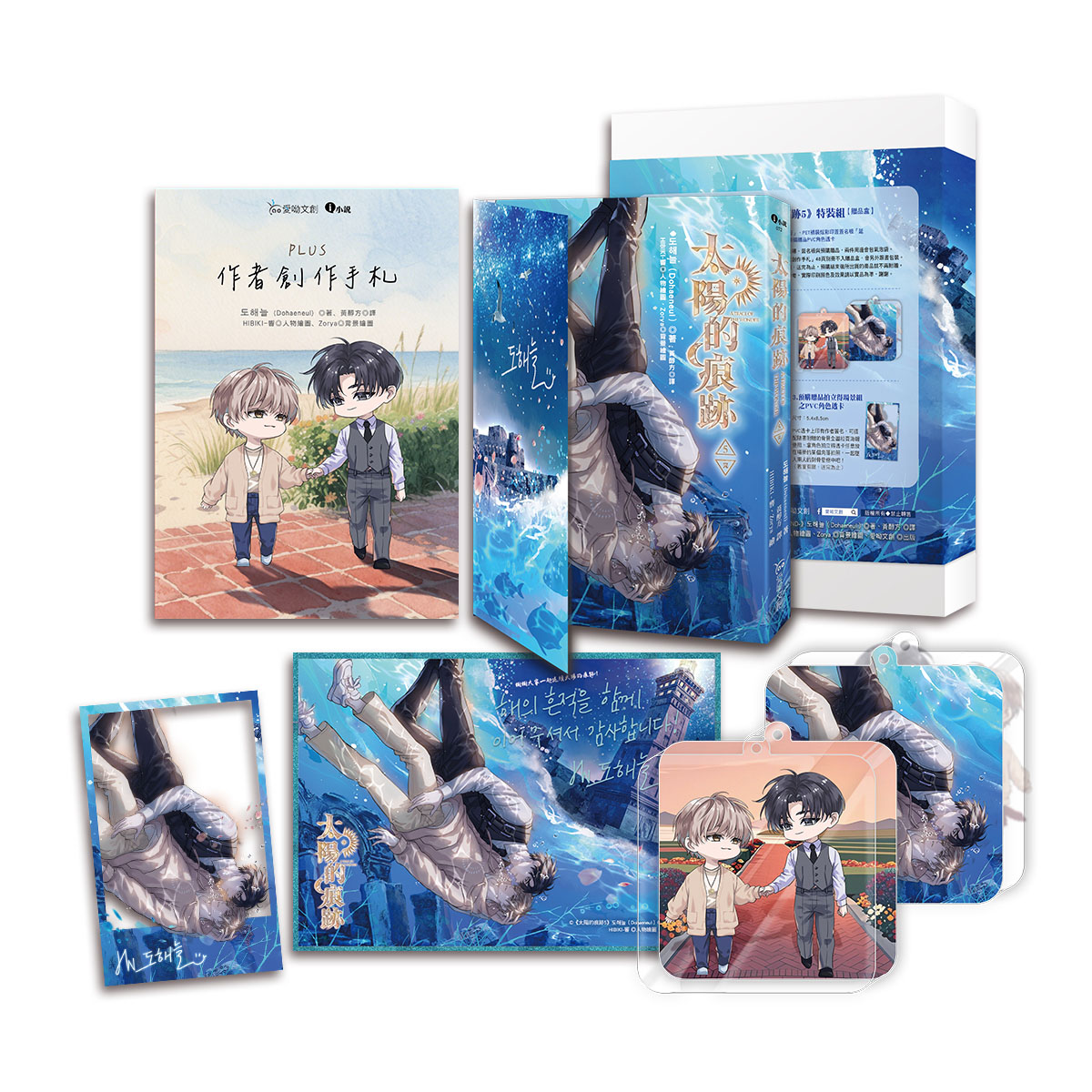 內容簡介 ★同步推出印簽特裝組,內附「作者創作手札」、PET裱裝燙印簽名板、壓克力厚磚,更多精采內容別錯過 ★ 最強隊伍為什麼叫做 Chord324──原來從隊名開始就已經在放閃? 更多不為人知的裡設計一一詳細揭露! ★戀情正要開始,整本近19萬字滿滿的番外,走腎走心! 8.8萬字IF番外,即使失憶也阻擋不了的致命吸引力! ★面對失憶重回20歲的史賢,鄭利善該如何是好? 鄭利善滿肚子委屈無處發洩──不是失憶了嗎?怎麼又是影子Play! ★隨書好禮大方送: 第一重:隨書附錄「法羅斯島燈塔」全景拉頁海報 第二重:隨書附贈精美留言卡 第三重:特殊裝幀書封,大折口上是修復成功的燈塔,打開折口則會露出沉在海底的遺跡及落入海中的兩位主角。折口上還有燙銀作者印簽,值得珍藏! ★預購限量好禮: 拍立得角色透卡乙張(5.4*8.5cm) PVC透卡上印有作者簽名,請搭配隨書附贈的背景圖拉頁海報使用,可拿角色拍立得透卡任意放在場景的某個角落拍照,一起墜入兩人的刻骨愛戀中吧! (數量有限,送完為止) 太陽的痕跡5(完)【印簽特裝組】╱小說、PLUS「作者創作手札」別冊、壓克力磚「與你同行」、PET裱裝炫彩印簽簽名板「延續太陽的痕跡」 = 商品簡介 = 1. 壓克力厚磚「與你同行」(吊飾╱擺飾兩用) 不含圓孔長邊6cm╱厚度8mm╱透明壓克力╱雙面不同圖╱附珠鏈╱保護膜請自行撕除 ——利善,看來我真的很喜歡你,比我自己以為的還要多 他牽著他,任由傾瀉而下的陽光照射,將兩人的影子交織,新的生命痕跡就此刻畫。不論未來有多少阻礙或困境,只要能兩個人在一起,便能克服萬難。利用壓克力磚的厚度製造景深效果。可當飯友擺飾,也可當吊飾使用。 2. PET裱裝炫彩印簽簽名板「延續太陽的痕跡」 14cm*20cm╱PET彩印╱燙印作者手寫金句╱火焰雷射閃底╱流沙藍蔥包邊 ──謝謝大家一起延續太陽的痕跡 由作者도해늘(Dohaeneul)手寫感謝金句與簽名,懷著感謝送給每一位太陽捕手!如同夜晚繁星一般,溫柔守候史賢與鄭利善的冒險。 備註: 1. 贈品盒內含壓克力磚、簽名板與預購贈品,兩件周邊會包氣泡袋 2. 特裝組附的「作者創作手札」48頁別冊不入贈品盒,會另外跟書包裝 3. 預購贈品數量有限,送完為止,預購結束後所出貨的商品就不再附贈 4. 商品示意圖僅供參考,實際印刷顏色及效果請以實品為準 5. 外包裝的贈品盒只是為保護產品之用,外盒若在運送過程中有些微碰撞凹損均為正常現象,不視為瑕疵 = 番外簡介 = PLUS「作者創作手札」別冊╱48頁╱橫排左翻╱騎馬釘 ★獵人們:獵人與SO市民們 接續《太陽的痕跡5》的特別番外三「歡迎」、IF番外「沒有影子的白天(上)」。透過網友們幽默逗趣的留言,從不同視角再現史賢與鄭利善之間的撒糖互動! ★特別收錄✦ 紙上訪談最終彈 繁體獨家限定,各種作者大小事即將解密!自認自己跟哪個角色最相近?與讀者最特別的記憶是……?最重要的,是一段送給臺灣讀者的告白呦! ★作者創作手札 作者親筆獻上的設定集──從世界觀的構築、角色的來歷, 到創作過程中的甘苦心情,誠意滿滿的創作花絮,不容錯過! = 小說簡介 = 自從古代世界七大奇蹟副本結束後,鄭利善就以修復工作為主,鮮少進入副本參與作戰了,生活逐漸回歸平靜。他和史賢交往的事情也陸續被Chord的主要隊員察覺,雖然大家一開始多少會感到有些震驚,但隨後都默默給予祝福。在愛情與友情的滋潤下,鄭利善終於漸漸打開心扉,有了活下去的欲望。 不料,一支新興隊伍急於一戰成名反而攻略失敗,導致魔王從副本逃至現實世界,並引爆了大規模的詛咒,讓剛好路過的鄭利善受到波及,陷入一場渴望已久的美夢中,昏迷不醒…… 史賢不眠不休地四處尋找解除詛咒的辦法,卻始終不得法,瀕臨崩潰之際,鄭利善好不容易才從美好的幻境中脫困,並成了解決副本的關鍵人物。憑藉只有 S 級修復師才具備的能力,鄭利善再次和史賢並肩作戰,兩人不僅配合默契,感情也因此更加堅定。 而經過此事,鄭利善終於徹底放下心結,擺脫往日陰影,並認清了自己的心意,決定在自己生日當天,要送給史賢一份精心準備的禮物⋯⋯ 「跟我一起住吧。」砰──鄭利善將一份文件拍在桌上。 史賢一愣,慢了一拍才看向那份文件。 透明的辦公桌上,擺著一份白色紙本──那是一份房屋買賣契約書。 =延伸閱讀= 愛生活◆愛閱讀◆愛創作 更多精采活動與新書訊息請關注: 愛呦文創粉絲團:https: www.facebook.com iyao.book
