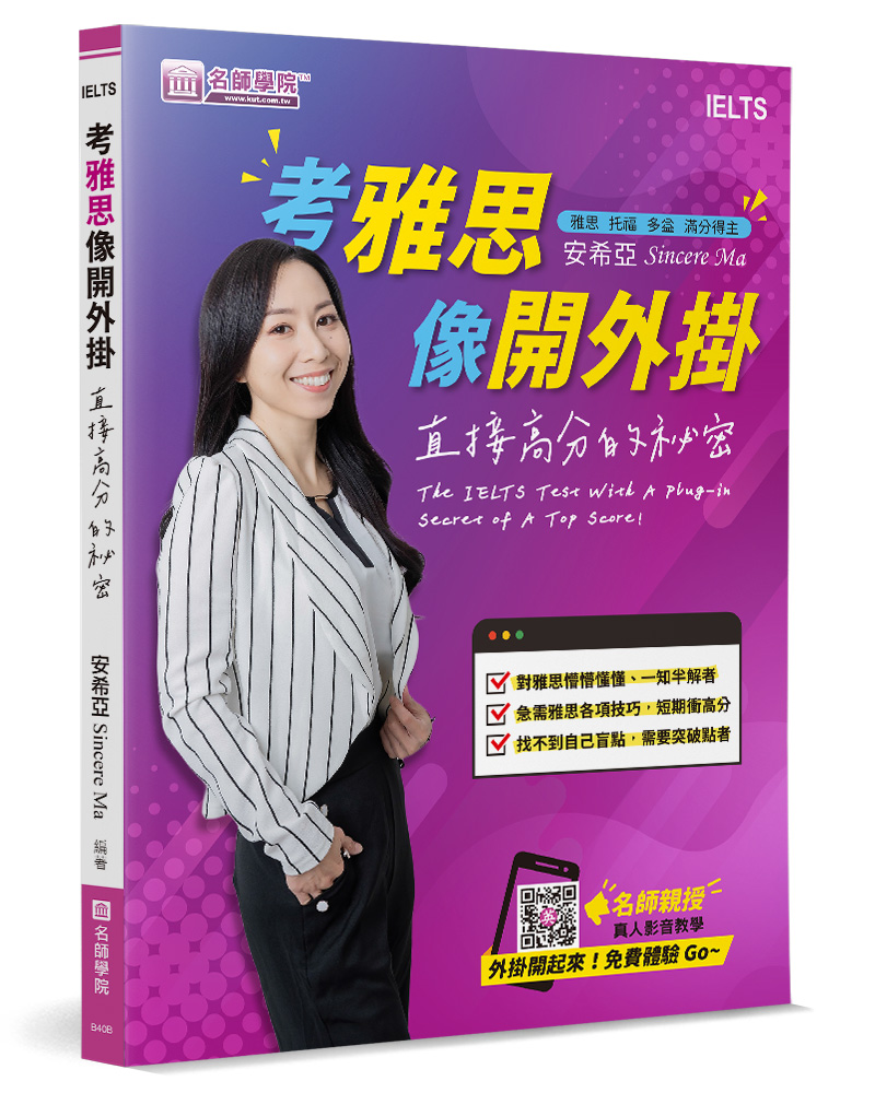 作者介紹 安希亞(Sincere Ma)學經歷:‧ 紐西蘭威靈頓維多利亞大學語言學、應用語言學碩士‧ 美國ATI教師協會、英國牛津大學教師進修協會TESOL證照‧ 雅思(IETLS)、托福(TOEFL)、多益(TOEIC)測驗皆滿分,英語教學經歷18年以上教學經歷:‧ 中國夏恩英語教學總監‧ 菁英英日語、格蘭英語、戴爾美語等各大補習班雅思、多益教師‧ 各大公民營機關與企業(北市警局、工研院、國泰世華銀行、廣達電腦等)英語講師‧ 各公私立大學(成大、台科大、高醫大、實踐等)英語講座講師‧ 高中多所名校(北一女、中山女高、台南女中、西松高中等)英語講座講師
