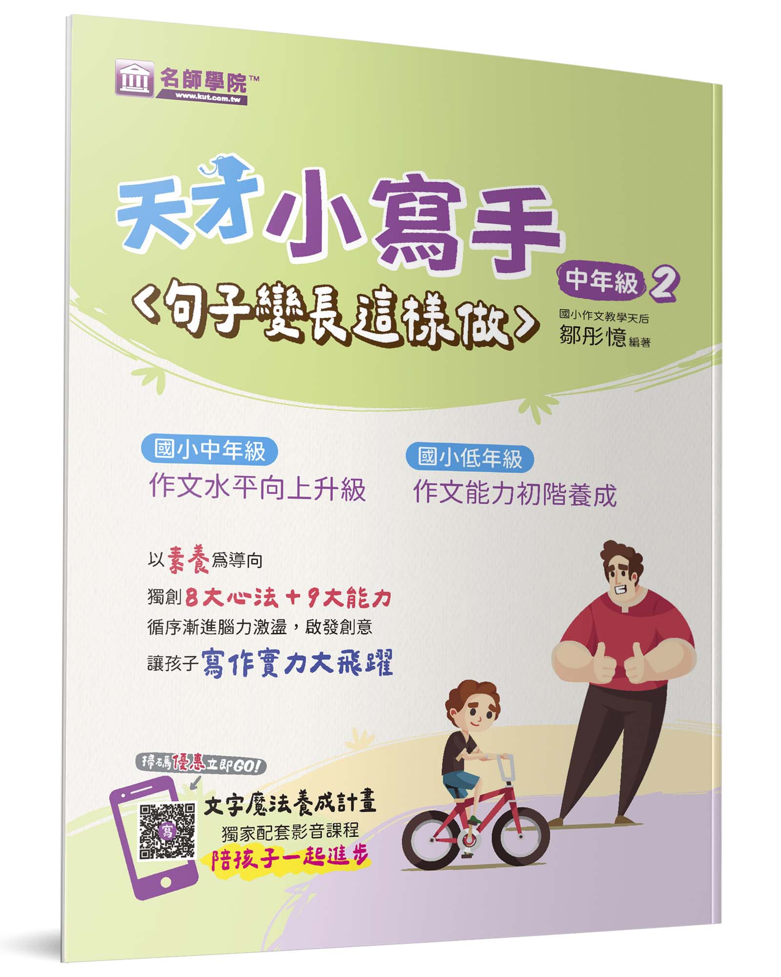 | 商品描述 | 天才小寫手 中年級 2: 句子變長這樣做:想讓孩子的寫作能力突飛猛進嗎?本書專為國小中年級量身打造!本書獨創「8大心法」與「9大能力」訓練,引導孩子從短句延伸到流暢的 |