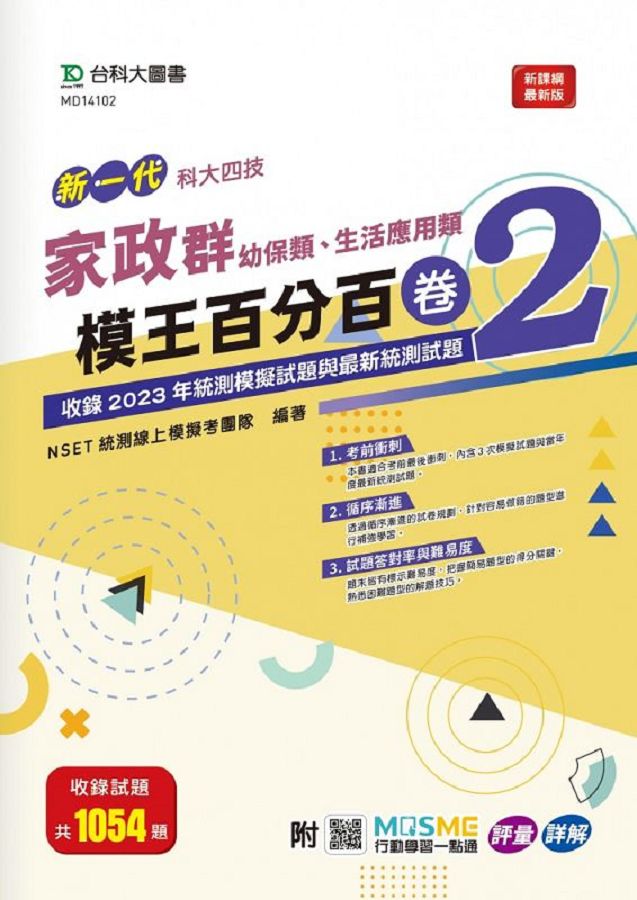 商品描述 | 新一代科大四技家政群幼保類、生活應用類模王百分百 卷2 (附MOSME行動學習一點通):產品特色:(1)考前衝刺:適合考前最後衝刺,本書含有三次統測模擬測驗並收錄當年度最新 |