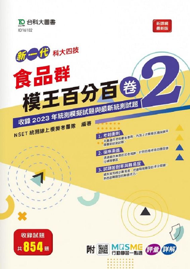 商品描述 | 新一代科大四技食品群模王百分百 卷2 (附MOSME行動學習一點通):產品特色:1.考前衝刺:適合考前最後衝刺,本書含有3次統測模擬測驗並收錄當年度最新統測試題。2.循序漸進 |