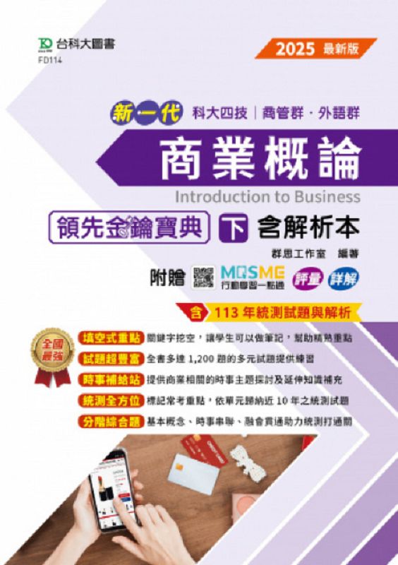 商品描述 | 科大四技商管群、外語群: 商業概論領先金鑰寶典含解析本 下 (2025最新版 附MOSME行動學習一點通):填空式重點:關鍵字挖空,讓學生可以做筆記,幫助精熟重點試題超豐富:全 |