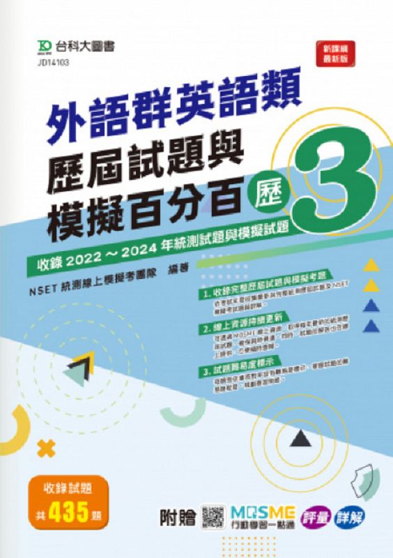 商品描述 | 外語群英語類歷屆試題與模擬百分百 歷3 (附MOSME行動學習一點通):★收錄試題共435題1.收錄完整歷屆試題與模擬考題:依考試年度收集最新與完整統測歷屆試題及NSET模擬考試 |