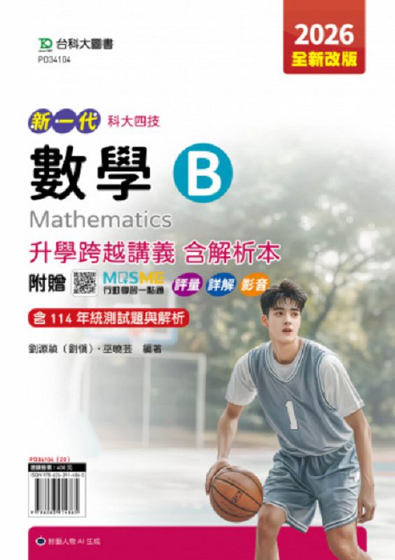 內容簡介 產品特色: 一、本書依據民國一○七年教育部發布之十二年國民基本教育課程綱要技術型高級中等學校數學領域「數學 B」編寫而成。 二、本書適用於商業與管理群、外語群、設計群、農業群、食品群、餐旅群、海事群、水產群等三年級總複習使用,內容包含第I冊至第IV冊。 三、每章內容依序為「重點整理」、「例題與練習」、「類題演練」、「歷屆統測精選」、「火紅素養題」等。 1.重點整理:將各章節內容重要觀念及公式作有系統的整理,條列或圖表化本章重點所在,詳細說明各章相關知識。 2.例題與練習:在重點整理之後,立即安排例題及練習,搭配簡單易懂的觀念影音,讓讀者可立即鞏固重點知識。 3.類題演練:每主題後皆編有題型之課後練習,方便讀者可檢視自我學習成效。 4.歷屆試題精選:本書將近10年的統測試題分章置於各章末,讀者閱讀全章後,可自我測試,加強熟練曾經考過的試題,增加考試信心。自107年度起,測驗中心公告每一選擇題的考生,並依據來判別難易度(小於40%表示困難,大於等於40%、小於70%表示中等,大於等於70%表示容易)。 5.火紅素養題:新課綱強調素養導向,本書於章末編有火紅素養題供練習,使讀者熟悉近幾年考題趨勢,輕鬆面對統測素養題型! 6.本書提供「考前衝刺」,濃縮教材精華,集合重要定義、性質、公式。 ◆【MOSME 行動學習一點通功能】 使用「MOSME 行動學習一點」,登入會員與書序號後,可線上閱讀詳解、自我練習,增強記憶力,反覆測驗提升應考戰鬥力,即學即測即評,強化試題熟練度。 1.評量:可在線上反覆練習書內各種題目;亦可連結至「歷屆試題」、「名師分享」(試題與影音)練習其它試題。 2.詳解:在線上即時取得各單元的試題解析,方便快速核對答案,並可隨時查閱詳細解析。 3.影音:提供書內例題及練習題之真人解題教學過程,點選「影音開啟」即可反覆觀看學習。