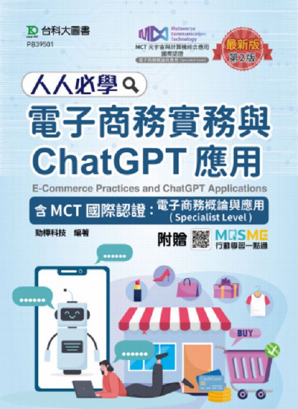 商品描述 | 人人必學電子商務實務與ChatGPT應用含MCT國際認證 (第2版 附MOSME行動學習一點通):1.本書帶領讀者了解電子商務的重要知識,也特別剖析電子商務的發展與未來,並介紹ChatGP |