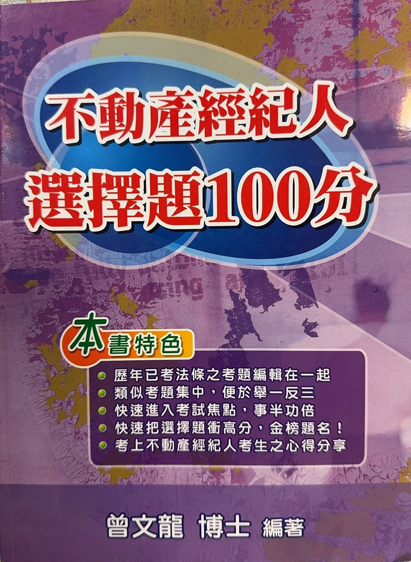 內容簡介 自 序(鄭重推薦本書) 國家考試,以考4題申論題為主,區區4題即要一試定終身!而且非努力背誦當「背多分」無法竟全功,弄得考生頭暈腦脹,甚至有「跳樓」的衝動!是以,國家考試若能部分有選擇題(即測驗題),則可謂救命仙丹! 而選擇題若為單選題,則最為輕鬆易行。(選擇題為世界國家考試的先進潮流,可考單選題、複選題,閱讀測驗……等題型),只要讀書有印象即可能答對,面對題目不甚有把握時,也有可能把它猜對!真是快樂! 吾人以不動產經紀人普考為例,申論題占50分,選擇題占50分(考25題,每題2分),只要認真用功,選擇題把握只錯3題時,則可拿到44分!縱算申論題不及格50分只拿25分,總分仍有44+25=69分!不但考上,還保證名列前茅呢!而且只要夠用功與細心,學生也有拿選擇題滿分的(如附錄),誠可佩也! 因此,選擇題如何拿到45分以上,即已是考取的保證,本書乃在特別編輯與考量下的產物,確可作為考生的最佳利器!曾文龍大 日 不 動 產 研 究 中 心 主任
