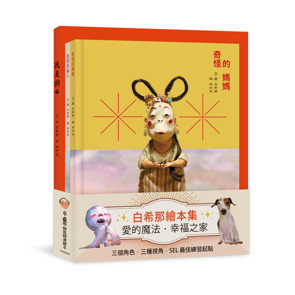 內容簡介 ◎林格倫紀念大獎得主白希那「韓流」風靡世界,全新典藏版,值得再度擁有!「白希那對素材、表情和動作的掌握都令人稱奇,她筆下的繪本充滿電影感, 帶領讀者通往奇妙、感性、犀利且令人眼花撩亂的世界。」 ──2020年林格倫紀念大獎評審「我期待自己的作品能為你帶來安慰,引起你的共鳴,淨化你的情緒,並將你逗笑。 我希望能夠減輕任何負面或悲傷的情緒,讓讀者在閱讀時感到高興和幸福。」──白希那◎饒富想像的白式童話白希那是說故事的高手,其作品常以現代都市的尋常家庭為背景,並透過輕度幻想的注入,讓精采豐富的想像與童話打破庸常,展現日常生活中的不凡與層出不窮的創意,為忙碌繁重的都市現代生活帶來希望、愛與溫暖。◎複合式創作媒材及擬真敘事風格在說故事的技巧上,她擅長以黏土代替平面繪畫,結合布藝、光影等藝術技法,再以借位攝影融入動畫手法傾力製作,兼具藝術性與真實性,展現獨特的藝術風格與作品魅力。各冊內容《我是狗》我叫「珠珠」! 這個叫東東的小子,真是個笨手笨腳的小麻煩, 愛哭又賴皮,有時候還會尿床…… 真沒辦法,只好由我來守護了。 因為——我們都是家人啊! 本書以珠珠的視角出發,訴說了牠自己的出生、來到主人家的過程,以及珠珠與人類主人相處的點點滴滴,舉凡在家嚎叫而挨爸爸的罵、看守著空蕩蕩的家、與奶奶出去散步,和小主人東東一起分享零食,甚至因為大便在床上而被處罰……人們平時與寵物相處的過程,在本書中無不被鉅細靡遺地描繪。 《奇怪的媽媽》孩子發高燒,自己卻要上班,該怎麼辦呢?在最需要幫助之時,超溫柔的「奇怪的媽媽」降臨了!一通陰錯陽差的電話,一位從天上下凡的仙女,熱騰騰、暖呼呼的「天界蛋料理」上桌囉! 《奇怪的媽媽》是作者白希那以自己照顧生病住院的孩子的經歷為原型所創作的繪本,描繪了一位職業婦女的生活日常,忙著準時上下班、忙著準備晚餐、忙著幫孩子複習功課……,彷彿沒有「下班」的一刻;卻還有「突發狀況」的發生,孩子生病、學校臨時停課……,多麼希望有神仙或魔法來幫忙,於是,誕生了天界仙女替代媽媽來照顧生病孩子這一段奇妙又饒富創意的故事,讓讀者產生深刻的共鳴。《奇怪的客人》當神祕的「天月露」帶著粉紅雲朵闖入一對姐弟的家,雞蛋精靈在廚房飛舞、冰箱飄出初雪、棉花糖雲瀰漫房間……雨天的意外訪客,一場治癒心靈的奇幻相遇!白希那用童話魔法,為日常生活注入愛與溫暖,將孩子的孤獨與渴望化作最溫柔的奇蹟! 《奇怪的客人》記錄著姐弟兩人齊心協力克服困難,幫助天月露順利回到天上的家的點點滴滴,故事的核心是那份樂於助人的善意——善良的心,也拉近了手足間的情感,成為一生難忘的珍貴回憶,讓彼此可以互相信任,並信心滿滿地克服任何難題。【本書關鍵字】 白希那、職業婦女、母愛、手足之情、生命教育、奇幻想像、複合式媒材、日常生活、童話、仙女、生病、雨天、媽媽、善心、友情、冒險、寵物、狗、動物故事【本書資訊】有注音適讀年齡:3~7歲親子共讀;8歲以上自己閱讀 【本書特色】1.新版開本,貼心適合幼童翻閱 作者調整新版開本,適合幼童小巧的雙手翻閱,無論是親子共讀或孩子自己翻閱,均大大提升了閱讀舒適感。2.新增「注音」,搭建低幼孩童識字、自己閱讀的鷹架 新版新增「注音」,照顧該繪本的適讀年齡,為學齡前大班、低年級孩童奠基識字、自己閱讀的能力。3.封面內頁重新設計,新增書衣,感性溫暖回歸《我是狗》①新增書衣,書衣內襯作者草圖、親筆簽名,提供讀者更多元的賞析與樂趣。 ②內頁處處可見細緻的符碼設計,作者重新為每個場景精心調整的色彩,為背景增添了深度和氛圍,清晰地展現了故事的敘事深度和空間脈絡。此外,人物的表情和動作也栩栩如生,彷彿要從書中跳出來一樣。《奇怪的媽媽》①新版封面以金黃色蛋液色調為主,並環繞盪紅金的五彩雲帶;新封面揭開了原本遮掩的雲霧,展現了仙女神祕而純白的面容,身穿圍裙的仙女,彷如點上胭脂的新娘,雙手交握,含蓄地向讀者問候。②新增書衣,紅色雲霧搭配背面雨中陽臺的景色,象徵著奇怪媽媽離開浩浩家溫柔的回望。書衣內襯作者草圖、親筆簽名,提供讀者更多元的賞析與樂趣。③內頁處處可見細緻的符碼設計,從與紅色封面相連的內頁,原本放了天界純白色的蛋,到書末悄悄神祕消失,是奇怪媽媽因為人間的蛋不夠用而拿去用,還是這些蛋象徵了天界賦予白希那的靈感故事?浩浩家日曆上的照片;仙女背後若隱若現的天界場景;雨中街道一閃而過的糖果祕方掌握者……,每一幕都等待讀者一起來解密。《奇怪的客人》①新版封面以粉紫色調為主,並環繞盪紫金的五彩光芒;新封面這位「奇怪的客人」乘著五彩雲朵而來,以既神祕又歡樂的面貌,注視著讀者;加上環繞著燙紫金的光芒,展現其古靈精怪的超能力。②新增書衣,正面與背面分別繪出彩雲、烏雲,作者用視覺來象徵姐弟與「奇怪的客人」相遇前後的情感。書衣內襯作者草圖、親筆簽名,提供讀者更多元的賞析與樂趣。③內頁處處可見細緻的符碼設計,作者重新為每個場景精心調整的色彩,為背景增添了深度和氛圍,清晰地展現了故事的敘事深度和空間脈絡。此外,人物的表情和動作也栩栩如生,彷彿要從書中跳出來一樣。 4.獨特複合式創作媒