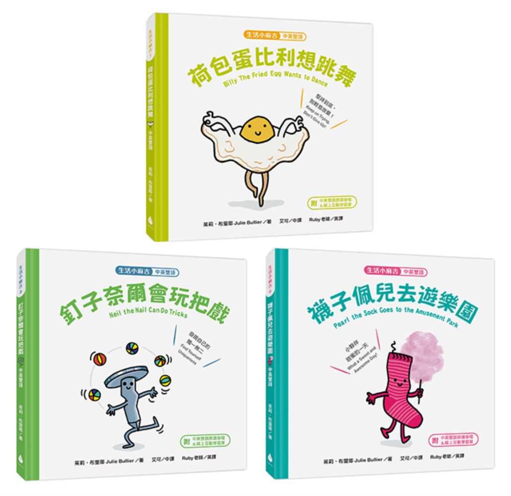 內容簡介 雙語素養.生活學習.品格教育.創意啟發 讓孩子正向學習,快樂成長! 英文名師Ruby老師獻聲朗讀,中英雙語故事隨掃隨聽 另附 生活小麻吉-線上互動學習單 哇,荷包蛋比利舞跳得真好! 咦,釘子奈爾在忙什麼呀? 還有,襪子佩兒怎麼能總是甜蜜蜜的? 仔細觀察,生活中到處是小麻吉的身影呢, 一起來找找他們都在哪裡, 向他們學習如何踏實生活、團隊合作, 勇敢追求屬於自己的夢想吧! 在生活小麻吉繪本中, 孩子不僅可以閱讀精采有趣的故事, 更能跟著他們一起學習正向解決問題、團結面對挑戰, 搭配書裡中英雙語對照和朗讀音檔, 以及可愛圖像中意想不到的巧妙設計, 讀繪本 = 雙語素養 + 生活學習 + 品格教育 + 創意啟發 用幽默而非說教的故事餵養孩子, 潛移默化中,讓孩子自發學習、自我成長, 是親子共讀的最佳讀物。 驚喜推薦(依姓名筆畫排序) Rubee。小紅寶(知名親子部落客、Rubee親子共讀創辦人) Ruby老師(知名英文講師) 陳櫻慧(童書作家暨親子共讀推廣講師、「思多力」親子品牌負責人) 黃淑貞(小兔子書坊店主) 黃筱茵(資深兒童文學工作者) 愛小宜(親子共讀部落客) 詹宇夫妻|蒙式夫婦 內容簡介 《荷包蛋比利想跳舞》 比利是個荷包蛋,不只熱愛跳舞,舞技也很棒。 可惜的是,家族裡找不到能跟他共舞的夥伴, 總是一個人獨自跳舞讓他有點傷心呢。 堅持夢想的他,最終能找到可以一起跳舞的小麻吉嗎? 荷包蛋比利很喜歡跳舞,但是,比起一個人跳, 他更想找到有默契的好舞伴,兩人攜手共舞。 只是,超硬蛋馬塞爾和他的夥伴們整天都忙著練拳擊; 復活節彩蛋加斯帕、巴茲和麥奇只喜歡玩捉迷藏; 水煮蛋阿倫正在跟湯匙瑪利歐、鹽罐路易吉瘋狂賽車中; 炒蛋諾爾和連恩到哪裡都黏在一起,形影不離。 比利找不到蛋家族朋友陪他一起跳舞,感到好孤單。 就在這時,比利竟然遇見了夢寐以求的舞伴! 兩人一拍即合,更在小麻吉世界掀起一陣熱舞風潮。 你也一起來跳舞吧! 《釘子奈爾會玩把戲》 奈爾是一根釘子,他的夢想是加入馬戲團, 跟堂兄弟們共同表演一齣拿手好戲。 沒想到夥伴們生病了無法一起上台, 眼看奈爾登台的夢想又要幻滅了,他該怎麼辦呢? 釘子奈爾從小就希望成為馬戲團的一員, 好不容易有機會登台演出, 沒想到他的堂兄弟夥伴都生病了, 他突然面臨演出被迫取消的命運。 他向撲克牌兄弟檔尋求幫助,但是他們已經要上場了; 他跟氣球一起排練,結果氣球都被奈爾戳破洩了氣; 叉子皮耶和衛生紙昆丁已經是完美的雙人組; 至於毛線球阿莉亞,她要自己表演踩高蹺。 奈爾試著跟碟子布魯斯和李一起表演特技時, 他踩到香蕉約瑟芬,滑了一大跤。 哎呀!所有人都哈哈大笑! 奈爾突然有了靈感,你知道他想表演什麼嗎? 《襪子佩兒去遊樂園》 佩兒是一隻襪子,和很多襪子小夥伴生活在抽屜裡。 佩兒有個情人昆斯, 他們倆時時刻刻都在一起,出雙入對。 這天他們去遊樂園玩,會遇到什麼有趣的事呢? 襪子佩兒今天生日呢,她和情人昆斯決定去遊樂園慶祝。 先來玩碰碰車吧!昆斯坐上運動拖鞋車, 佩兒挑了室內拖鞋車,雖然沒那麼敏捷,但是更有耐力! 接著,他們挑戰用球擊倒罐頭塔的遊戲, 還買了好吃的棉花糖一起享用。 後來他們跑去玩海綿迷宮時,一瞬間卻走散了。 幸好,在大蔥里克的幫忙下,兩人終於找到彼此! 最後,所有衣服小夥伴都跳入洗衣機玩旋轉泡泡浴。 啊,衣服小夥伴都被佩兒和昆斯染色了。 大家都變成像玫瑰一樣的粉紅色,好甜蜜! 本書特色 ★中英雙語+線上朗讀:特別邀請深受大小朋友歡迎的Ruby老師獻聲朗讀,書末附上QR code,中英雙語故事隨掃隨聽! ★生活學習:角色設定符合生活中各種物品的特性,增進生活小常識。 ★品格教育:故事逗趣,更在潛移默化中傳達友情分享、勇敢冒險、喜歡上學、克服恐懼等各項正向特質,在孩子心中種下正能量的種子。 ★創意啟發:將生活小物品擬人化,可愛插畫搭配易讀文字,激發孩子想像力。 ★互動學習單:精心設計「生活小麻吉-線上互動學習單」,內容包括「如何共讀這本書?」的重點提示,實用有趣的「趣味小測驗」,還有能讓孩子想一想、說一說的「動動腦時間」。