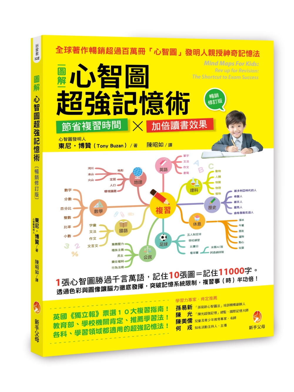 內容簡介 全球著作暢銷超過百萬冊「心智圖」發明人親授神奇記憶法節省複習時間&加倍讀書效果〔重量級著作〕‧英國《獨立報》票選10大複習指南!‧教育部、學校機關肯定、推薦學習法!‧各科、學習領域都適用的超強記憶法!〔重量級學習〕1張心智圖勝過千言萬語,記住10張圖=記住11000字。透過色彩與圖像讓腦力徹底發揮,突破記憶系統限制,複習事(時)半功倍!心智圖協助孩子把複雜的知識組織化、層級化,不只更容易寫入大腦,更能專注思考、延伸想像,記得快,記得多,記得牢,記得久,還能更專心。〔超強筆記術〕幾枝色筆+1張白紙,促進各領域學習效果與效率,減輕壓力,提升學習與生活品質,還能成為考場常勝軍!觀察孩子花了多少時間,準備以下科目?‧數學 ‧國語 ‧英語 ‧社會(歷史、地理)‧自然一般人的答案,通常是幾千個小時(以上)吧,好驚人!但是運用心智圖法,只需要「幾個小時」就能準備完成。結合筆記與計畫的突破性學習系統,幫助孩子成功應付各科,事半功倍。獲得理想成績的同時,還能讓孩子擁有更多時間、釋放壓力,不再為學習苦惱。〔學習力專家.肯定推薦〕何 戎‧知名活動主持人、主播孫易新‧「孫易新心智圖法」培訓機構創辦人陳 光‧「陳光超強記憶」總監、國際記憶大師陳美儒‧兒童及青少年教育專家、名師