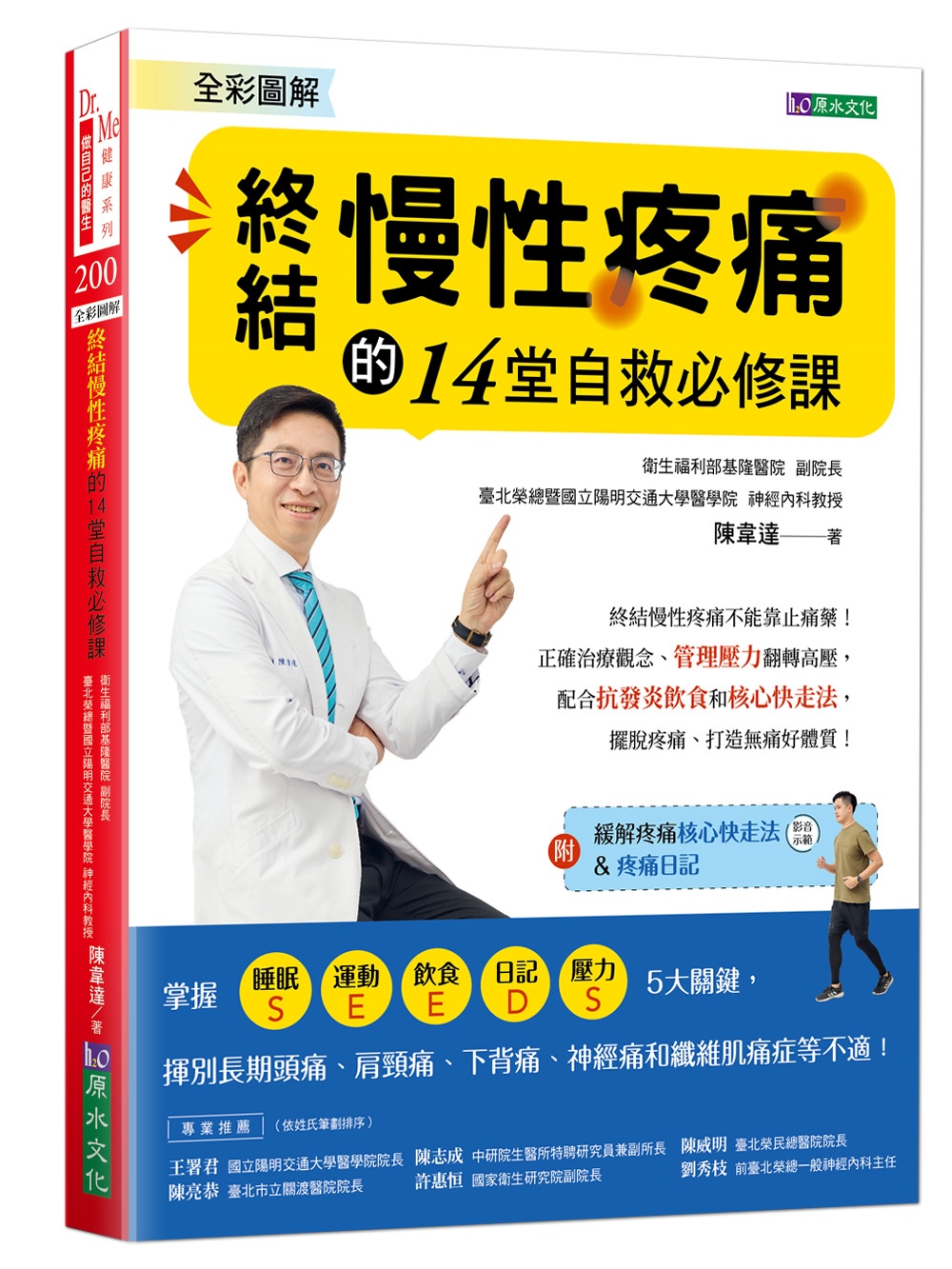 這本書透過14 堂課來拆解慢性疼痛。第1、第2 堂課介紹慢性疼痛的概念以及臨床如何確定診斷。第3 至第7 堂依部位介紹各種常見的慢性疼痛。第8、第9 堂課簡介各種臨床常用的藥物與非藥物治療,包括中醫等等。第10 至第14 堂,則是教讀者如何以SEEDS (Sleep, Exercise, Eat, Diary, Stress)的架構,打造健康生活型態, 也就是遠離慢性疼痛的五大生活須知。