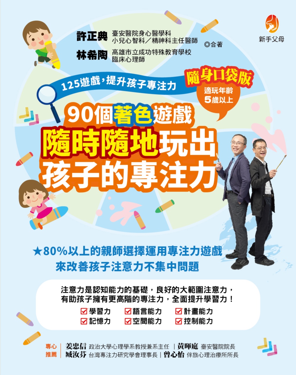 作者介紹 許正典醫師現任:臺安醫院身心醫學科/小兒心智科/精神科主任醫師學歷:陽明醫學院醫學系經歷:高雄榮民總醫院精神科、台北市立療養院精神科、台大醫院精神科專長:兒童青少年精神醫學、老年精神醫學、一般精神醫學、復健精神醫學、個別心理治療、家族治療、團體心理治療、行為治療等。其它:台灣精神醫學會精神科專科醫師、台灣兒童青少年精神醫學會心智科專科醫師、國立台灣師範大學兼任講師相關著作:《125遊戲,提升孩子專注力隨身口袋版:90個迷宮遊戲,隨時隨地玩出孩子的專注力》《125遊戲,提升孩子專注力隨身口袋版:90個連連看遊戲,隨時隨地玩出孩子的專注力》《125遊戲,提升孩子專注力系列1:每天10分鐘,陪孩子玩出高階專注力,學習更有效率(125遊戲,提升孩子專注力1暢銷修訂版)》《125遊戲,提升孩子專注力系列2:每天10分鐘,陪孩子玩出高階專注力,學習更有效率(125遊戲,提升孩子專注力2暢銷修訂版)》《125遊戲,提升孩子專注力系列3:每天10分鐘,陪孩子玩出高階專注力,學習更有效率(125遊戲,提升孩子專注力3暢銷修訂版)》《125遊戲,提升孩子專注力系列4:每天10分鐘,陪孩子玩出高階專注力,學習更有效率(125遊戲,提升孩子專注力4暢銷修訂版)》《125遊戲,提升孩子專注力系列5:每天10分鐘,陪孩子玩出高階專注力,學習更有效率(125遊戲,提升孩子專注力5暢銷修訂版)》《125遊戲,提升孩子專注力系列6:每天10分鐘,陪孩子玩出高階專注力,學習更有效率(125遊戲,提升孩子專注力6暢銷修訂版)》《99迷宮遊戲,把專心變有趣暢銷增訂版》《99連連看遊戲,把專心變有趣暢銷增訂版》《99著色遊戲,把專心變有趣》《99迷宮遊戲,把專心變有趣》《99連連看遊戲,把專心變有趣》《125遊戲,提升孩子專注力6》《125遊戲,提升孩子專注力5》《125遊戲,提升孩子專注力4》《125遊戲,提升孩子專注力3》《125遊戲,提升孩子專注力2》《125遊戲提升孩子專注力1》《125遊戲,有效提昇專注力》《125遊戲,玩出專注力》林希陶臨床心理師現任:高雄市立成功特殊教育學校 臨床心理師學歷:國立台灣大學心理學系、國立台灣大學心理學研究所臨床組經歷:凱旋醫院臨床心理科臨床心理師、臺安醫院兒童發展復健中心臨床心理師專長:臨床兒童心理衡鑑與治療、臨床兒童神經心理衡鑑相關著作:《125遊戲,提升孩子專注力隨身口袋版:90個迷宮遊戲,隨時隨地玩出孩子的專注力》《125遊戲,提升孩子專注力隨身口袋版:90個連連看遊戲,隨時隨地玩出孩子的專注力》《125遊戲,提升孩子專注力系列1:每天10分鐘,陪孩子玩出高階專注力,學習更有效率(125遊戲,提升孩子專注力1暢銷修訂版)》《125遊戲,提升孩子專注力系列2:每天10分鐘,陪孩子玩出高階專注力,學習更有效率(125遊戲,提升孩子專注力2暢銷修訂版)》《125遊戲,提升孩子專注力系列3:每天10分鐘,陪孩子玩出高階專注力,學習更有效率(125遊戲,提升孩子專注力3暢銷修訂版)》《125遊戲,提升孩子專注力系列4:每天10分鐘,陪孩子玩出高階專注力,學習更有效率(125遊戲,提升孩子專注力4暢銷修訂版)》《125遊戲,提升孩子專注力系列5:每天10分鐘,陪孩子玩出高階專注力,學習更有效率(125遊戲,提升孩子專注力5暢銷修訂版)》《125遊戲,提升孩子專注力系列6:每天10分鐘,陪孩子玩出高階專注力,學習更有效率(125遊戲,提升孩子專注力6暢銷修訂版)》《99迷宮遊戲,把專心變有趣暢銷增訂版》《99連連看遊戲,把專心變有趣暢銷增訂版》《心理師爸爸的心手育嬰筆記》《99著色遊戲,把專心變有趣》《99迷宮遊戲,把專心變有趣》《99連連看遊戲,把專心變有趣》《125遊戲,提升孩子專注力6》《125遊戲,提升孩子專注力5》《125遊戲,提升孩子專注力4》《125遊戲,提升孩子專注力3》《125遊戲,提升孩子專注力2》《125遊戲提升孩子專注力1》《125遊戲,有效提昇專注力》《125遊戲,玩出專注力》
