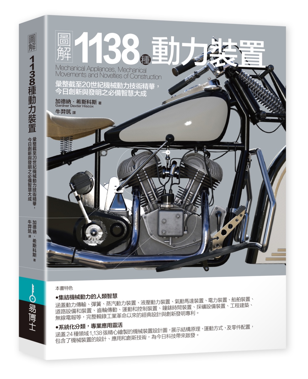 內容簡介 百年前最聰明的人類大腦,為工業革命和近代科技鋪陳的智慧結晶!從萬用型螺絲起子、太陽能引擎、考利斯汽門、蒸氣鍋爐、螺旋槳、電動擺錘,到棉花籽脫殼機、馬鈴薯清洗機、幾何繪圖器等各式各樣的機械機構裝置,本書收錄過去人們因應文明需求所發明的各項智慧裝置,經過工藝創新與科技進步,許多發明至今仍有效地應用於百工百業中,有些雖如靈光乍現卻令人頻顧稱奇。本書並以專章記錄百年來針對永動機的探索,一窺這些最聰明的人類挑戰永恆運作的命題,所迸發出最精采嶔崎的創造力。本書涵蓋24個重要領域,透過1,138張插圖,深入淺出闡明機械裝置動力的基本型態和原理,探討實務應用與創新構造的可能性,收錄作者當時可見的最新機械技術與重要的創新發明。本書經過系統化編纂,是不可或缺的當代機械動力裝置文獻,表彰截至20世紀初機械技術的最高智慧,對後來的機械設計、機械工程教育和發明創新產生難以計量的深遠影響。 本書特色‧集結機械動力的人類智慧涵蓋動力傳輸、彈簧、蒸汽動力裝置、液壓動力裝置、氣動馬達裝置、電力裝置、船舶裝置、道路設備和裝置、齒輪傳動、運動和控制裝置、鐘錶時間裝置、採礦設備裝置、工程建築、無線電報等,完整輯錄工業革命以來的經典設計與創新發明專利。‧系統化分類,專業應用靈活涵蓋24種領域1,138張精心繪製的機械裝置設計圖,展示結構原理、運動方式、及零件配置,包含了機械裝置的設計、應用和創新技術,為今日科技帶來啟發。 本書收錄20種以上的專利發明改良式動力曲柄(5C)、船舶用水管鍋爐(89)、三段膨脹引擎(144)、離心調速器(216)、摩擦力控制器(224)、平衡伸縮接頭(244)、轉子引擎(260)、離心泵(290)、水力馬達(298)、撓性球形接頭(306)、多翼式風扇鼓風機(340)、折疊臂式(918)、磁力和重力(921)、水輪問題(936)、搖動後樑(932)、傾斜托盤和滾球(933)、差速水輪(937)、永動機(945)、磁擺(963)、永動機交替磁鐵式(968)等。