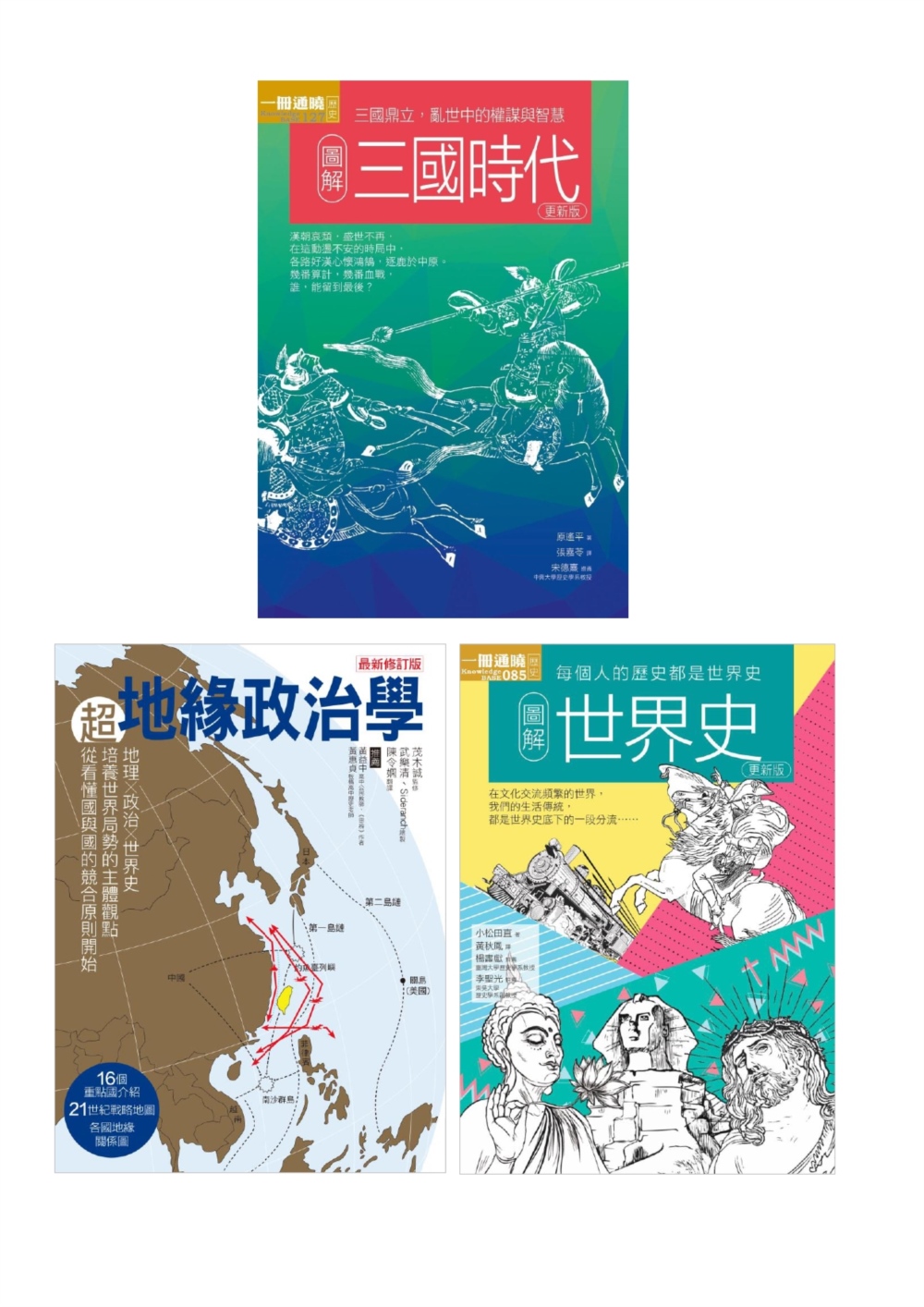 內容簡介 單書介紹 第一冊:圖解三國時代更新版:三國鼎立,亂世中的權謀與智慧 漢朝衰頹,盛世不再, 在這動盪不安的時局裡, 各路好漢心懷鴻鵠,逐鹿於中原。 幾番算計,幾番血戰, 誰,能留到最後? 東漢末年,朝政敗壞,各方勢力蠢蠢欲動,在董卓伏誅後群起割據互爭領土,正式拉開三國時代的序幕。群雄爭霸,軍將各為其主,在遼闊的中國大陸上,為了忠誠大義、為了自身理想,人人奮不顧身,彼此爾虞我詐。身處亂世,血統與身分已不再是權力的保證,想要成就霸業,唯有才智與實力才是成功的關鍵。 江山如畫,一時多少豪傑。三國時代不只是遙遠的歷史故事,本書以正史《三國志》為主、小說《三國演義》為輔,不僅介紹歷史的發展過程,也講述當時的時代背景與地理環境,並且說明人物成敗因素、戰術謀略運用等,帶領讀者走入三國時代的兵荒馬亂之中。紛紛擾擾數十年,含恨殞落者有之,趁勢而起者有之,魏蜀吳三分天下,明爭暗鬥費盡心機,共同寫下一齣高潮迭起的三國時代。 第二冊:超地緣政治學最新修訂版:地理×政治×世界史,從主體建立世界局勢觀點,從看懂國與國的競合關係強化本體 美國高階官員為什麼不惜激化中國陸續造訪台灣? 對抗中國的日英軍事同盟,在英國脫歐後加速形成? 在地理宗教經濟因素下,俄烏戰爭背後關係著海權的爭奪? 「接壤的國家互相敵對、敵人的敵人就是朋友」 不懂地緣政治學, 就無法深入世界各國內心最深處,摸清城府底細! 在這個地理距離看似漸被消弭的世界,遠方戰事也透過經濟牽動著我們的日常生活。了解、預測世界局勢的變化走向,已成為現代人不得不面對的重要課題。不想成為不諳世事逃避現實思想貧瘠的阿傻、國際處境上的海中孤島、被其他國家虎視威脅,就唯有睜開雙眼看清楚國際局勢,靜思謀動不卑不亢,主動參與世界的未來! 本書從地緣關係的角度切入,搭配漫畫與地圖,分析各國的行為緣由,剖析最新國際政經局勢,帶領讀者跳脫思考框架,站在各國立場了解地理因素如何影響政治軍事戰略、經濟政策、盟友選擇等,從歷史脈絡掌握事件發展走向,不再只是單向接收資訊、輕易被口蜜腹劍的言論所迷惑。踩穩思考的基礎,自己也能判讀世界的局勢現況,反思臺灣的未來! 第三冊:圖解世界史更新版 在文化交流頻繁的世界, 我們的生活傳統, 都是世界史底下的一段分流…… 地球是圓的,歷史上的事件總是如蝴蝶振翅般息息相關,沒有一個國家能夠獨善其身,不與世界接軌。自古以來東西往來就相當頻繁,透過貿易與侵略,世界各地彼此交流,無論是物質還是精神,我們的生活傳統中早已融入許多異國文化,並且轉化為自己的一部分,發展出獨有的文化色彩。 世界史不只是他國他人的過去,沿著文化脈絡溯源,每個人的身上都是一則世界史的總結。本書以交流、跨界為核心,跳脫過去一時一地的框架,詳細敘述自有人類以來,世界是如何變革、重組與融合,從政治、經濟、戰爭到宗教、思想、文化,各個層面都有解說,將世界千年來的變遷盡收眼底,並且特別列出中國與日本的歷史做為參照。帶領讀者掌握世界的發展脈絡,回首過去、反思現在,跨出腳步,翻出歷史新頁!