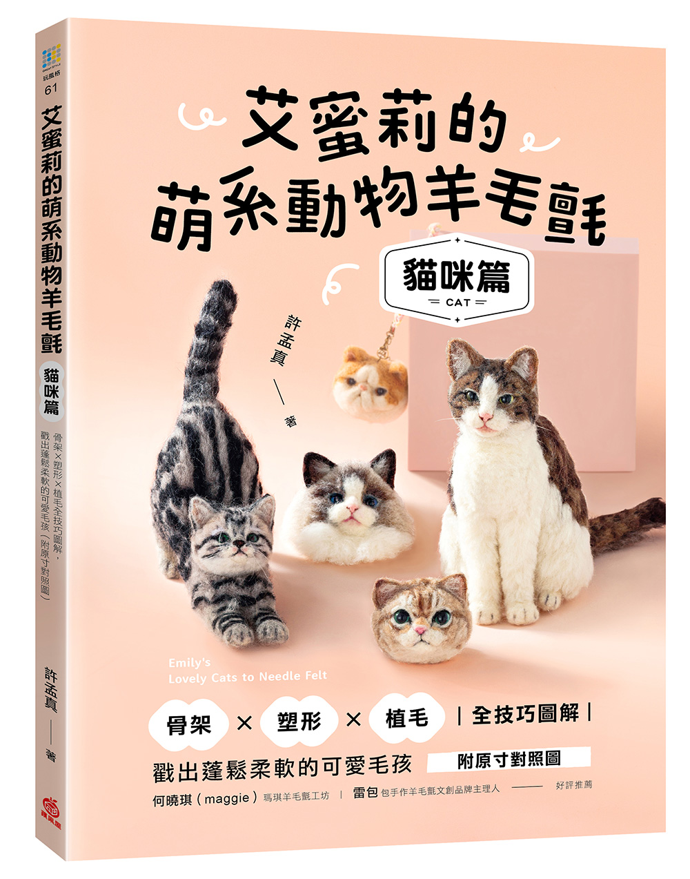 內容簡介 蓬蓬的布偶貓、圓潤的英國短毛貓、活潑靈敏的白底虎斑貓,相較於其他動物的羊毛氈,貓咪的體格、輪廓差異小,因此神韻更為重要!書中除了提供「成貓」和「幼貓」兩種體型的示範,也集結適合初學者入門的5種貓咪羊毛氈,帶大家透過不同花色的貓咪,逐步練習骨骼、塑型、植毛技巧,並學習如何表現坐姿、伸懶腰姿勢,以及利用戳針調整眼神等細節處理。曾經是藥師的艾蜜莉老師,因為對羊毛氈的喜愛而投入手作教學,在這本書中,她將自己近十年來的製作經驗與心得,鉅細靡遺收錄!以邏輯去拆解戳刺過程,並提供自己繪製的原寸對照圖,即使還不熟悉手感,也能夠對照出貓咪的平衡比例,戳出可愛感!無論你是想要復刻自家萌寵、喜歡羊毛氈,還是渴望以此創業,都能透過本書得到很多想法!並一起體會羊毛氈帶來的快樂與療癒。◎ 本書特色:特色1. 難以抗拒的萌感!最受歡迎的「貓咪羊毛氈」,超細節公開!動物羊毛氈界的超人氣課程──艾蜜莉老師的「貓咪羊毛氈」,不藏私完整收錄!包含金吉拉、美國短毛貓、布偶貓等學生最愛、也最適合用來練習技巧的貓咪,每一款都可愛到讓人融化!特色2. 系統化完整技巧!製作貓咪羊毛氈的所有過程,一次全學會。書中收錄了長毛、短毛等五款不同特徵的貓咪,以及成貓、幼貓的差異教學。不只能夠學到骨骼、基底、塑形、植毛到組裝配件的全面技巧,也告訴你如何挑選工具材料、混毛等基礎知識。特色3. 完整的全步驟分解+重點技巧QR碼影片,最好懂的教學書!不跳步驟,不省略說明,艾蜜莉老師將所有製作細節拍攝成數百張照片,逐一加上箭頭指示毛流、植毛方向,以及詳盡的文字解說,並在技巧章節錄製重點影片,讓你翻書就能確實掌握技巧。特色4. 全書獨家繪製:成貓&幼貓骨骼+原寸對照圖,成功率大增!動物羊毛氈最常「走鐘」的原因,就在於比例抓不好!為此,本書全作品皆附有艾蜜莉老師親自繪製、原尺寸的分解版型,從骨骼到本體的製作,只要對照就能精準抓到比例,戳出萌系毛孩!