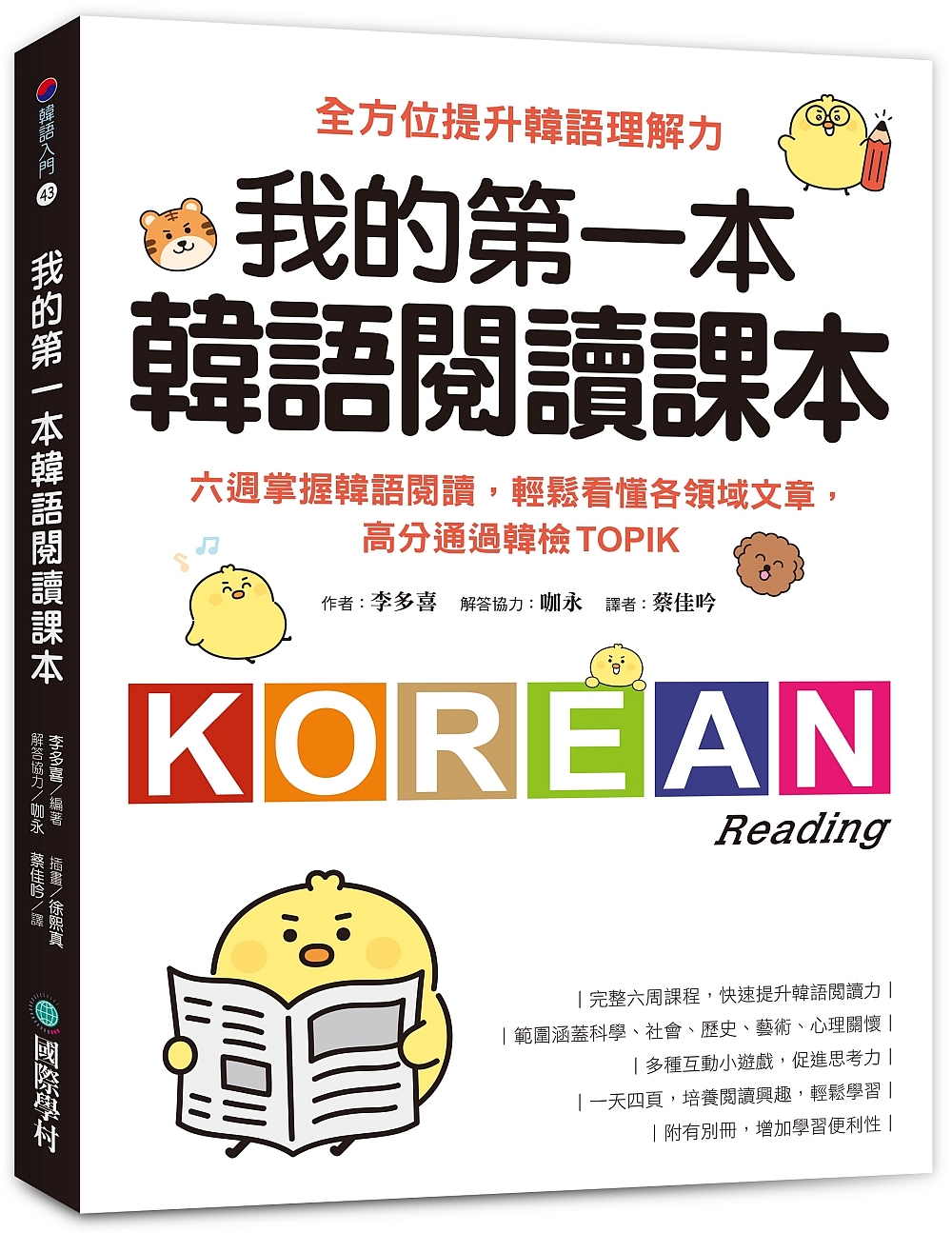 | 書名 / | 我的第一本韓語閱讀課本: 六週掌握韓語閱讀, 輕鬆看懂各領域文章, 高分通過韓檢TOPIK |