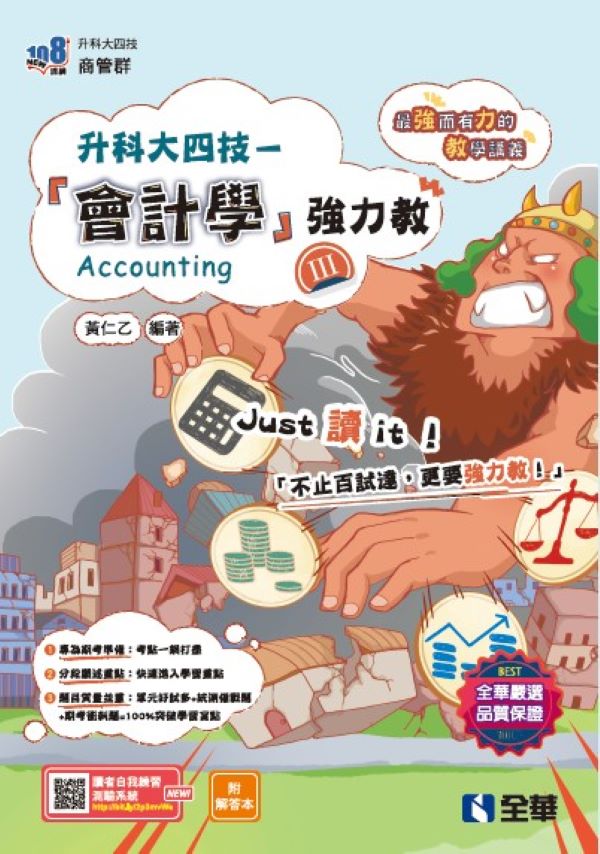 商品描述 | 升科大四技會計學 III: 強力教講義 (2026最新版 附解答本):本書係依據108年最新公告會計學課綱教材編著整理而成。教材內容參照一般公認會計原則(國際財務報導準則IFRSs) |