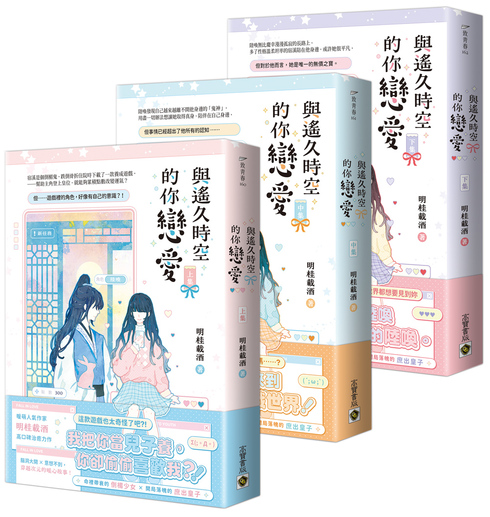 內容簡介 ★暖萌人氣作家 明桂載酒 高口碑治癒力作★命裡帶衰倒楣少女 × 開局落魄的庶出皇子 ★腦洞大開×意想不到,穿越次元的暖心故事!(上)倒楣少女宿溪下載了一款養成遊戲,系統表示:只要破任務、扶持主角走上帝王之位,就可以改變她的運氣。宿溪心想:有這麼好的事?那她一定要玩玩看。當她見到遊戲裡的可愛小人陸喚,便把運氣這件事拋之腦後──「現在下著大雪,我要幫他買炭火!」「衣服都破了,我要幫他買衣服!」「那些欺負他的人,我要全部欺負回去!」宿溪玩得不亦樂乎,但她卻漸漸覺得不對勁──咦,她觸發了什麼劇情嗎?他可以寫紙條給她?!怎麼她沒上線,他……就一臉被拋棄的模樣?!(中)宿溪驚呆了,這遊戲人物也太有智慧了吧?!陸喚並不知道,自己並非真實存在,但當他看見自己的屋子裡憑空出現了很多華貴大氅,農田裡還多了一個從未見過的防寒大棚,他雖然還摸不著頭緒是誰送來的,卻明白那人並無惡意。他誤把那人當成幫助他的「鬼神」,也期盼有一天能見到「鬼神」,他貪戀她對他的善意、關懷、溫暖,見到她對別人好,心中的妒意就瘋狂滋長。他寫下紙條,滿心期待地盼自己能和「鬼神」見一面……宿溪一個頭兩個大,自己在螢幕外,怎麼可能與陸喚見面啊!而且他竟然還說要幫她「借屍還魂」?!不,崽崽,你只是個遊戲人物,別這麼有智慧啊!當陸喚得知,想看見宿溪不過是痴人說夢罷了,他掩飾失落,繼續想辦法讓她留在自己的身邊,然而事情已經超出了他所有的認知……(下)當宿溪看著螢幕上的陸喚時彷彿有種與他對視的錯覺,他用執拗的神情望著她,令她心慌意亂,面紅耳赤,她覺得自己莫名其妙,這只不過是個遊戲吧?她慌亂的移開視線,但遊戲內外的世界以及她的心境,已悄然改變……陸喚迫切地救濟百姓、開倉賑災、治理洪水決堤, 拚了命的立下數件大功,恢復九皇子的身分,才有本錢與其他皇子爭奪皇位,──這一切,只不過是為了能夠早點見到宿溪。她驕傲地看著眼前的少年,無比慶幸自己玩了這款「遊戲」。他也無比慶幸漫漫孤寂的長路上,多了前來渡他的女孩。或許她很平凡,但對於陸喚而言,她是唯一的無價之寶。