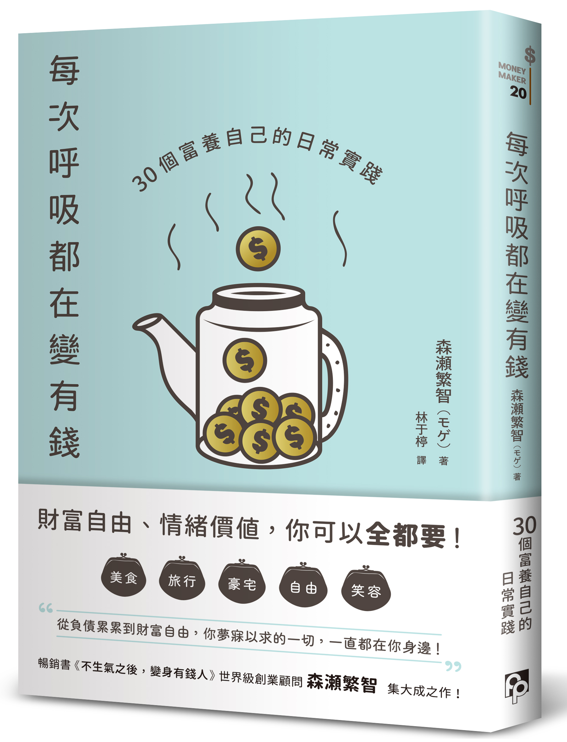 作者介紹 森瀬繁智(モゲ)一般社團法人 日本WaLife推進協會 代表理事一般社團法人 「金錢的心情研究所」代表理事WaLife股份有限公司 代表董事ONLINE SALON「幸福有錢人養成所(SOY)」校長賺錢與幸福的專家,打造女富豪的專家。兩個孩子的父親,熱愛他的妻子、工作,也熱愛歡笑。曾因為三千萬日圓的債務,工作過勞到醫生建議休養,沒錢的兩夫妻過著向人下跪借錢的生活。之後,他開始重新審視人生,創造出歡樂輕鬆且笑著工作的生活型態,躋身「幸福有錢人」。主要擔任女性創業者的顧問,培養出許多年營業額超過2,000萬日圓的客戶。因此被稱為「打造幸福有錢人的妖精」。講座及個人諮詢有著「聽過一次就能有人生飛越二十年份的效果」的廣大好評,可以笑著一刀斬斷客戶長年以來的心結。據說他給的建議會超乎客戶的想像。儘管個人諮商所費不貲,預約仍需等待好幾個月時間。經營海外研習會也是盛況空前,在杜拜、香港、澳門、新加坡、巴黎、拉斯維加斯、夏威夷等地區都擁有眾多追隨者。現與最愛的妻子、孩子們享受著半退休的生活。著有《每次呼吸都在變有錢》、《看漫畫學致富》、《不生氣之後,變身有錢人》、《LOVE & MONEY:被愛與金錢滿足的四個法則》、《要不要按下有錢人開關?》、《超強!變身有錢人》等書。譯者介紹林于楟政治大學日本語文學碩士。從生技界轉行而來,一頭栽入文字的世界中,現為專職譯者。譯有《極簡溝通》、《為什麼他有錢又有閒?》、《別去死啊!被霸凌不是你的錯》、《你在這裡,能呼吸嗎?》、《她的L:騙子們的攻防戰》等多數。