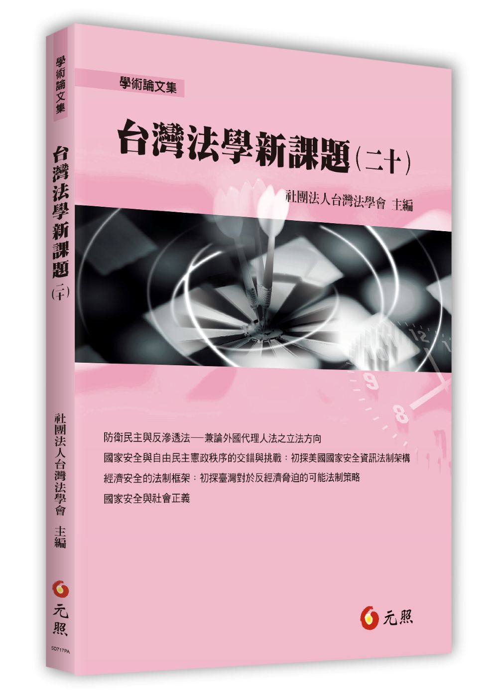 | 簡介 / | 台灣法學新課題 二十:本書收納四篇台灣法學會2024年年度法學會議所發表的學術論文,題目分別為,「防衛民主與反滲透法—兼論外國代理人法之立法方向」、「國家安全與自由 |