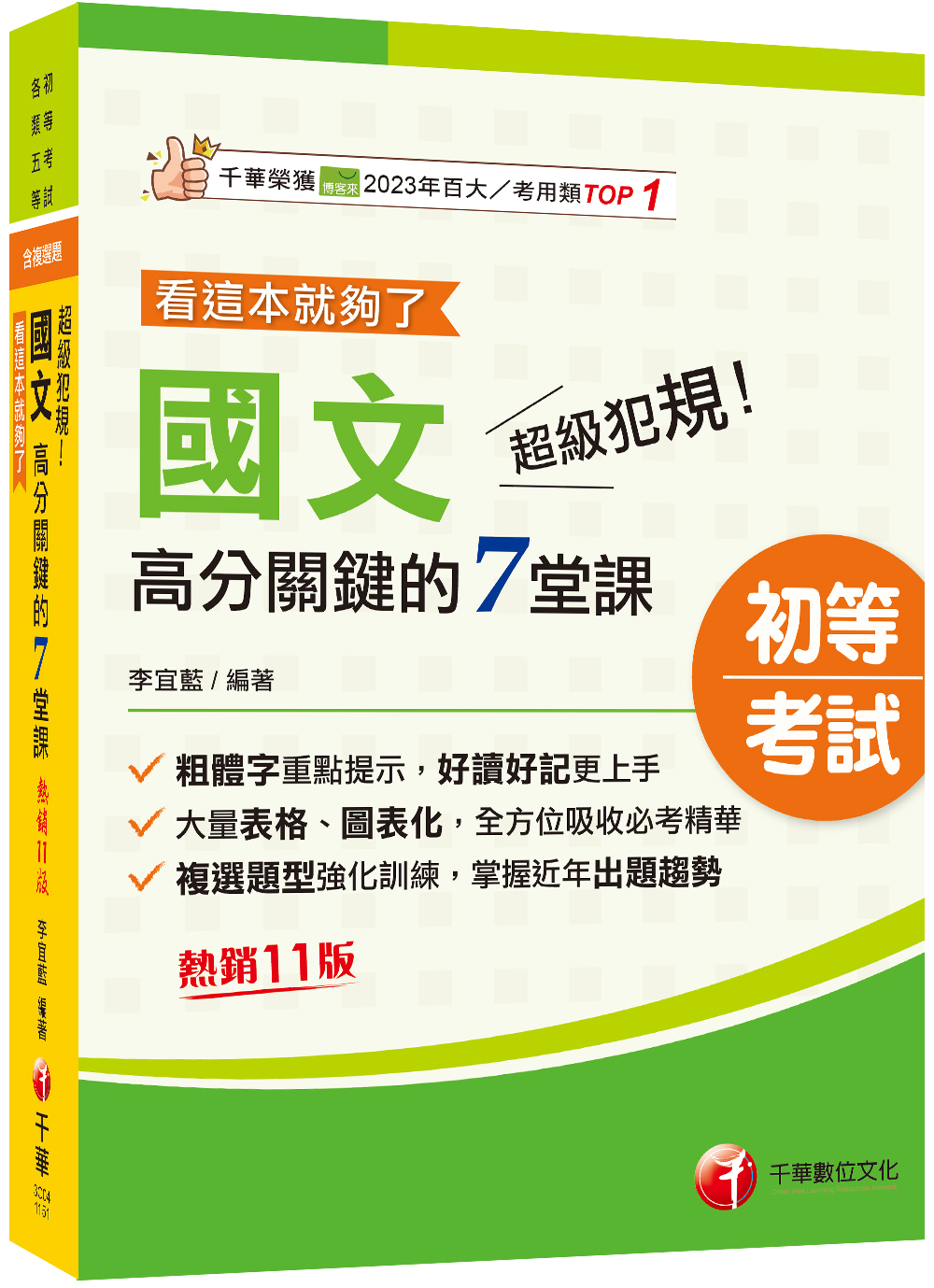 作者介紹 千華國文科名師-李宜藍曾任:文學週刊編輯、補教老師著作:超級犯規!國文高分關鍵的七堂課看這本就夠了超級犯規!國文高分關鍵的七堂課(鐵路特考佐級)超級犯規!郵政國文高分關鍵的八堂課國文完全攻略[升科大四技] 警專國文─滿分這樣讀一次考上銀行 國文
