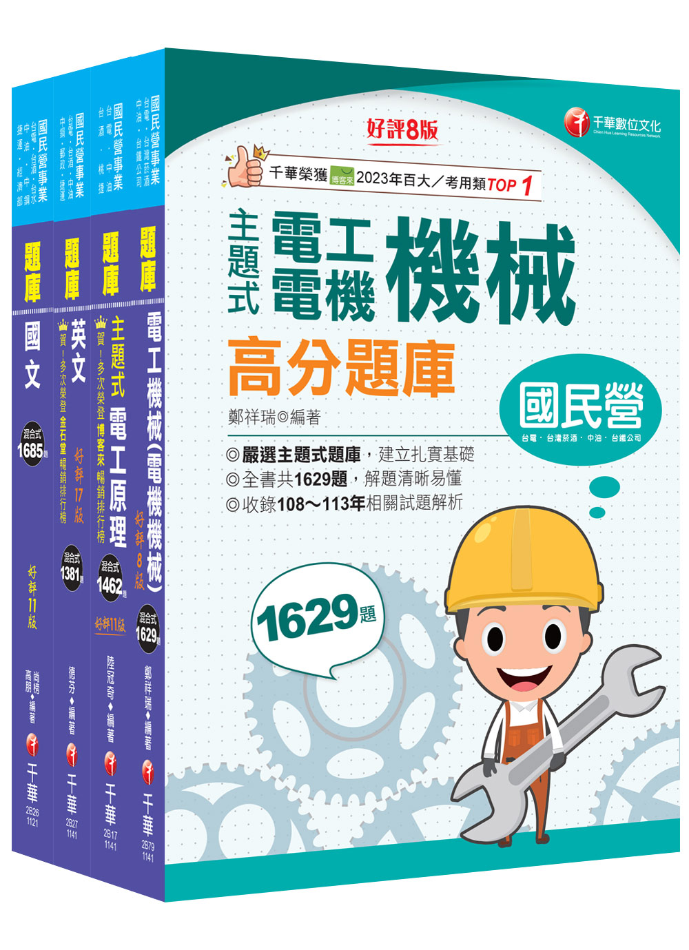 產品目錄 【套書內容】 《國文高分題庫》2025 06《國民營英文高分題庫》2024 12《主題式電工原理精選題庫》2024 12《主題式電工機械(電機機械)高分題庫》2024 12★★ 註:套書出版日期為該套書籍上架日,實際單本出版日期請依單本為主。★★