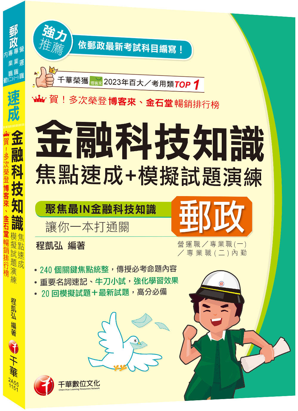 內容簡介 ◎240個關鍵焦點整理,傳授必考命題內容◎重要名詞速記搭配牛刀小試,強化研習效果◎20回模擬試題+最新試題,高分必備演練本書共分為三大部分。第一部分「焦點速成」依考試公告內容分為15章,各章內文特色有三:一是有關金融科技知識的本文內容,用在介紹該章必考命題內容之知識傳授;二為「重要名詞速記」,旨在將與該章有關金融科技知識相關領域的專業名詞加以解說,使你更能深入理解課文相關內容,減少填鴨式的死背;第三則是「牛刀小試」,旨在即學即測,強化各位研習效果。第二部分「模擬試題演練」為本書專有特色,共計20回;每回各有25題,20回合計共有500題;最棒的是這500題中,沒有一題是重複的。各位用心讀完第一部分後,如能三不五時踏實地自我演練這20回,相信「金融科技知識」這個考科,必可攻取高分。第三部分是「近年試題與解析」,收錄最新中華郵政的考題,並逐題附上詳盡的解析,讓你不僅能有藉由實戰經驗來掌握考題方向,更可以藉 由解析來了解自己不夠熟悉的地方,能夠及時的再考前釐清概念,對考試拿分很有幫助!金融機構經營轉型‧迫在眉睫不容怠忽數位科技的浪潮席捲了全球金融市場,區塊鏈、網路化、行動化的發展趨勢,將對我國金融機構之經營環境產生重大的影響,即使是交通部所屬兼辦郵務、儲匯及壽險的中華郵政公司亦不例外。金融科技是一種破壞式創新,除了金融本身必須未雨綢繆進行調整體質外,對於人才的培訓和教育訓練都需要更多的投入,在金融科技應用上加 速提升,如此才能提高經營效率與競爭實力,並提供給民眾更便捷優化的金融創新服務。提綱挈領切入各類主題‧緊扣命題趨勢攻取高分由於金融科技知識係以資訊科技為根本,應用在金融領域方面。今中華郵政公司「職階人員筆試應試科目(核定本)」中將→營運職《郵政三法》、專業職(一)《郵政三法概要》、專業職(二)內勤《郵政三法大意》,皆從過往只考《郵政法》《郵政儲金匯兌法》及《簡易人壽保險法》條文內容,修正為三者皆加考《金融科技知識/單選題,占50%》,考試分數比重相當高,故已成為第1試能否錄取的關鍵之鑰。 由於大部分考生熟讀郵政三法並不難,但要入門《金融科技知識》都有相 當難度,如要順利過關斬將,更顯得困難重重。本書之編寫就是要協助考生,能以最快速且易懂的方式登入金融科技堂奧,進而獲取高分,順利進入第2試。 今編者將金融研訓院過往《金融科技力知識》所有歷屆證照考試的試題,依測驗科目的章節順序分門別類,加以分析、歸納、統整;再參考專家、學者有關金融科技知識領域的論文、著作,兩者內容融為一體編寫本書, 自忖應可協助考生得心應手,順利通過考試。【千華聊書室】這是一個由 千華數位文化 製作的YouTube單元,我們以 AI Podcast + 人文視角,輕鬆掌握關鍵的命題焦點與趨勢https: youtu.be ZzZ99axnnkc?si=ZW2XHiG5mQUsfiTc