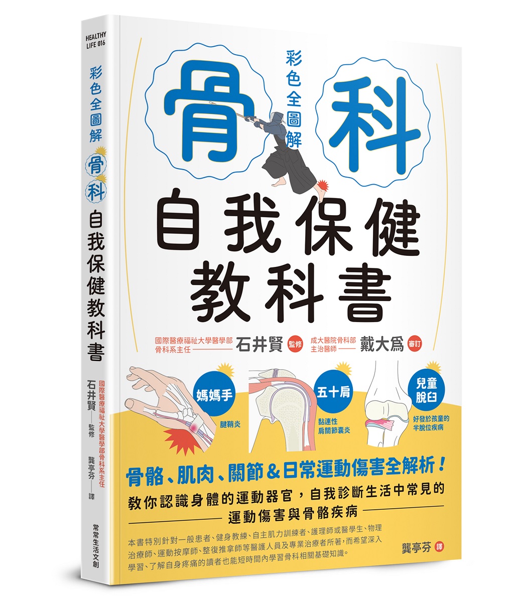 作者介紹 【監修】石井賢國際醫療福祉大學醫學部骨科系主任。成田醫院副院長、骨科部長、脊椎脊髓中心主任。三田醫院骨科部長、脊椎脊髓中心主任。畢業於慶應義塾大學醫學院。從美國喬治城大學和哈佛大學留學回來後,曾先後擔任慶應義塾大學醫學院專任講師和約聘專任教授,而後轉任現職。同時也擔任日本骨科學會代表、日本脊椎脊髓症學會理事、微創脊椎治療學會理事長、抗衰老醫學會理事。擅長以淺顯易懂的方式解說運動器官和骨科方面的相關知識,因此經常受邀登上電視節目、廣播節目、報章雜誌等媒體。【審訂】戴大為成大醫院骨科部資深主治醫師,專長為退化性關節炎、骨質疏鬆症治療及微創人工關節置換手術。戴醫師亦熱衷於骨骼關節保健知識的衛教,經常撰寫衛教文章或拍攝影片放置於個人網站或同名YouTube頻道「骨科戴大為醫師」。龔亭芬目前從事專職翻譯工作,作品累積達上百本。喜歡優游於文字世界裡,從中吸收與摸索各種新知識,尤其偏好醫學保健、美食與推理犯罪。譯有《透視人體圖鑑》、《推拿師的解剖生理&伸展教科書》、《足部、踝關節痛的物理治療大全》、《宇治田潤的法式甜點驚豔配方》、《人氣拉麵店烹調技術》等書籍。