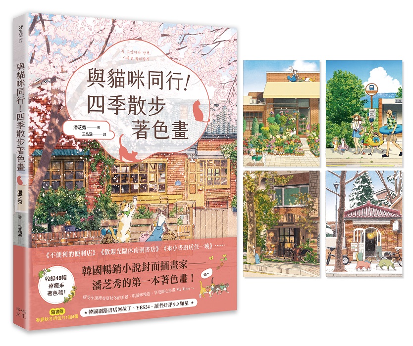 商品描述 | 與貓咪同行! 四季散步著色畫 (附春夏秋冬明信片1組4張):10.4萬IG粉絲的韓國療癒系書封插畫家,帶來可愛的貓咪散步著色畫《不便利的便利店》《歡迎光臨休南洞書店》《來小 |