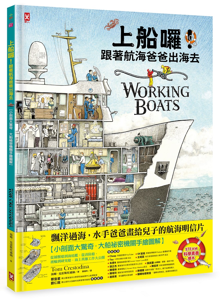 內容簡介 一本能讀上百次的海上冒險圖鑑!∞|每頁都埋藏無數小驚喜|∞故事+知識+驚喜小小朋友一看就停不下來,一讀就變身小小船長!▋小剖面大驚奇.大船祕密機關手繪圖解▋♥飄洋過海~水手爸爸畫給3歲兒子的航海明信片本書作者湯姆身兼船員、畫家與工程師,在離家出海工作的日子裡,他太想念遠方的兒子了。於是,他把對兒子的思念,畫成一本航海明信片。每一張圖裡,都藏著爸爸的知識,也藏著對兒子的想念。畫裡有各種大船的剖面圖,有正在閱讀、寫詩、下網捕魚、繪製海圖的水手,還有路過的虎鯨、鯨魚、海豚......各種海洋生物。透過這些畫,湯姆終於能夠一直陪在兒子身邊,讓兒子看見自己在海上的工作和生活!★哪種魚餌的味道,最能吸引帝王蟹?為什麼帝王蟹捕撈船的船艏,設計得非常高聳?★在科學研究船上工作,需要擁有哪些技能?★Mayday!Mayday!Mayday!對講機傳出這三個字時,代表什麼意思?★想知道海底地圖是如何繪製出來的嗎?★零下40度的魚艙,漁民要如何防鮭魚凍傷?★為什麼大比目魚的雙眼長在同一側?這樣特殊的生理結構,必須使用哪種釣魚方法?★救生筏如何自動充氣?噴射引擎如何讓船隻倒退?▋超大開本▋35.5 X 26.6 cm 超大開本設計,讓絕美的大船插圖更震撼!✔ 10艘最壯觀的海上工作船,一次看個夠!整本書就像一部海上探險寶典,從英勇的海岸巡防艦、滅火高手消防船、阿拉斯加的刺網漁船,到美國科學研究船,每艘船都有不一樣的祕密任務,快來成為小小水手,學習分辨各種海上英雄!✔ 神祕船艙裡藏什麼?大船立體剖面超圖解作者彷彿把整艘船「剖開」一般,呈現出船隻由大至小的各式機關,帶你進入駕駛試、船長室、魚艙、機艙、製圖室、實驗室、健身房和廚房,探索船上的每一個角落。✔ 跟著船員出海,體驗有趣的航海生活!這不只是一本介紹大船的書,還帶著孩子了解船員的工作&日常:捕魚、維修機器、煮飯、導航、寫詩(沒錯,船員也會寫詩!)原來在海上生活這麼精彩!✔ 邀請台灣船舶專家&漁業專家審訂確保內容知識正確無誤,讓孩子家長讀得開心也放心。✔ 知識量爆棚,小朋友永遠看不膩!用簡單易懂的語言+比喻法,解釋各種特殊漁法,並教導如何閱讀航海圖;還有各種安全救生裝備、雷達、引擎、傳動系統、救生筏、升降滑輪……的設計原理,滿足熱愛科普知識的所有小小讀者!✔ 超精美扉頁設計,手繪航海繩結作者手繪19種海上工作常用的繩結,包括:牛結、貓爪結、水手結、雙套結……,孩子也能拿起繩子,照著圖片步驟,一起玩繩結!【媒體好評推薦】.「所有對海洋世界感到好奇的男孩、女孩以及大人,都能從Tom Crestodina的手繪圖中,收穫許多樂趣,與一籮筐的內幕知識!」──《紐約時報》(The New York Times).「如果一張圖片值千言,那麼湯姆如此精細的剖面圖至少能傳達五千言。對任何熱愛航海的人來說,無論8歲還是80歲,這本書都能一次滿足!」──《National Fisherman》.「這是一本既具知識性又充滿樂趣的讀物,適合對大船及其運作方式感興趣的讀者,書中細節一定能深深吸引他們。」──美國圖書館協會《Booklist》.「如果你的孩子對故事不感興趣,卻熱愛非小說類書籍──尤其是探究船隻的運作──這本書會是絕佳的禮物。」──《蒙特婁公報》(Montreal Gazette).「這本書是孩子最棒的學習材料,對父母而言也是。精緻的插圖能吸引剛開始閱讀的孩子,隨著孩子閱讀能力的提升,他們就能更深入翻閱細節的內容。整本書的設計也很吸引成年人。」──《安克拉治每日新聞》(Anchorage Daily News).「書中涵蓋大量剖面圖,細節非常豐富。」──《科克斯書評》(Kirkus Reviews)