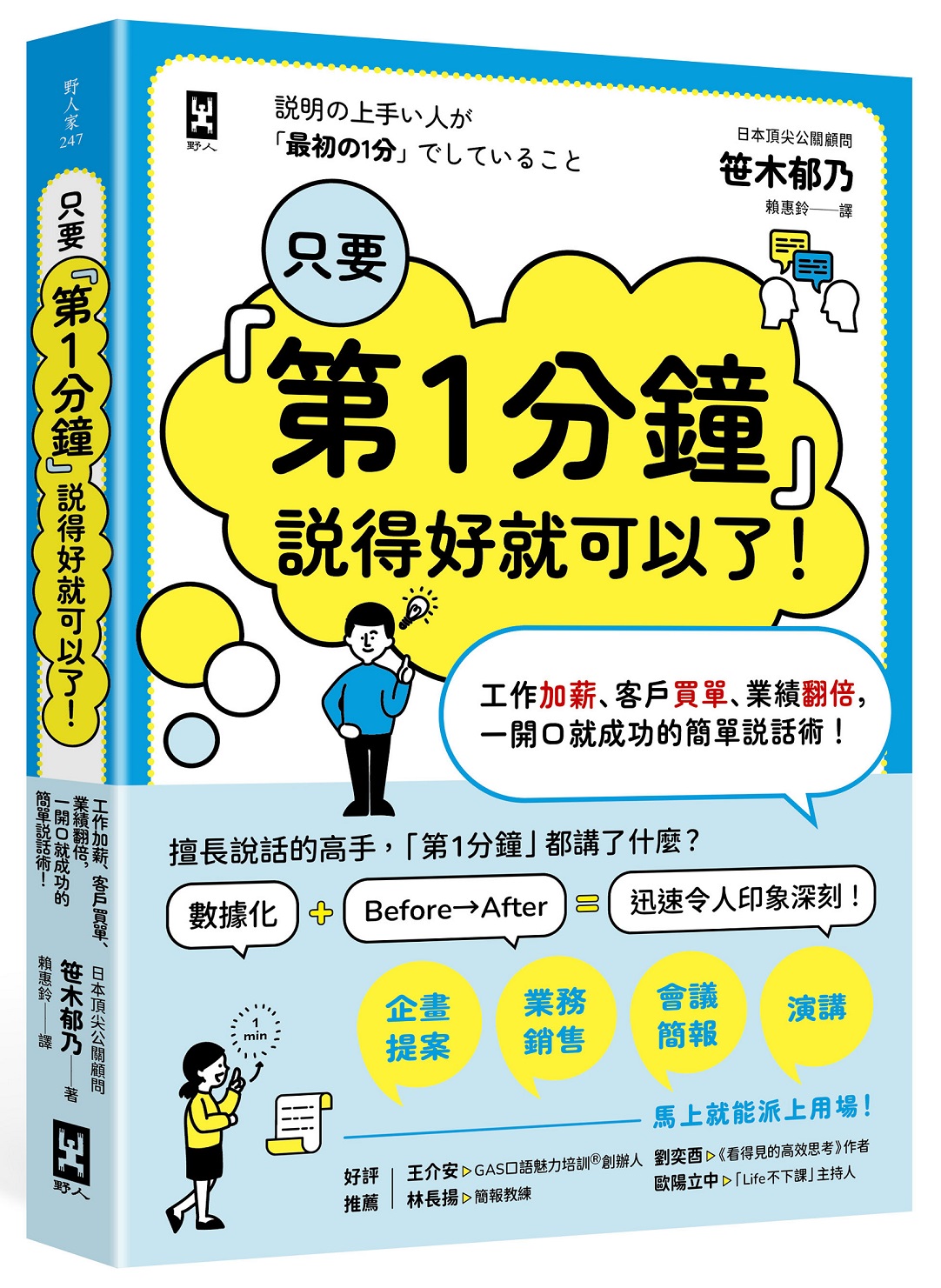 內容簡介 從職場菜鳥到公關女王,只要改變「說話的第1分鐘」,大家都搶著聽你說!\\開會不再冷場、簡報台下不再睡成一片//普通人也能上手的神級說話術!★鐵鍋界愛馬仕「小V鍋」爆紅推手X日本頂尖公關顧問,最受歡迎的說話技巧收費課程,不藏私大公開!★說話的成敗,「開場的第1分鐘」就決定了!【適用對象】✔銷售與業務人員 ✔創業家 ✔自媒體經營者 ✔上班族 ✔面試求職者 ✔大學生「以前一想到要開口說話,我就極度焦慮,但原來~只要準備好『第1分鐘』,剩下的就輕鬆了!」作者笹木郁乃原本是個對「說話技巧」一竅不通的理科研究生,憑著滿腔熱情進入公關公司上班,卻因為說話結巴、表達無趣,拿到了全公司最差的C等考績。在差點被開除後,她痛定思痛,歸納出抓住人心的「第1分鐘說明技巧」,成功協助公司將營收從1億日元提升至115億日元(只花費短短5年!)之後,更成功把日本偏鄉生產的職人鑄鐵琺瑯鍋「Vermicular」(小V鍋),打造成連在台灣都需等待12個月的精品琺瑯鍋!原來,改變命運的關鍵,就在開場的「第1分鐘」!書中以真實案例、公式化步驟拆解「第1分鐘說明技巧」,帶你學會在最短時間內吸引聽眾、建立信任、贏得對話主導權。從銷售到開會、從簡報到面試,不論你是否善於表達,只要掌握這套「6步驟說話公式」,你會發現:不管開口談什麼,大家都聽得津津有味!▊6步驟說話公式,在第1分鐘就讓對方點頭、心動、行動!★Step1 主題句→把全部內容濃縮成「一句話」,切記,只能一句!【目標】抓住「注意力」,讓聽眾馬上理解主題★Step2 展現實際績效→如何用數據、圖表說明你的優勢?【目標】展現「說服力」,讓聽眾馬上相信「這個人說的話可信」★Step3 提出「前後對照」→如何讓聽眾迅速知道「使用前」、「使用後」的明顯差異?【目標】喚起「想像力」,讓人具體感受到美好未來能帶來的快樂★Step4 特色→如何強調自己與他人的差異化特色?【目標】打造「獨特力」,讓你在眾人中被一眼記住★Step5 說故事→如何說一段同時包含「失敗」和「成功」的故事?【目標】喚醒「共鳴力」,讓聽眾在情感上與你產生連結★Step6 精準提案→給聽眾兩個選擇,破除猶豫!【目標】引發「行動力」,讓對方主動同意你的提案只要依據這個邏輯來建立自己的對話庫,就能用最快的速度提升說話技巧。即使再內向、再不擅長表達的人,也能在任何場合只用1分鐘就挑起對方無限的好奇心!▊讀完這本書,你會有這些變化!.(以前)話還沒說完,聽眾就開始打呵欠→(現在)解說完畢,聽眾依然興致勃勃.(以前)講了10分鐘,聽眾依然一臉問號→(現在)只講1分鐘,對方就迅速理解.(以前)想打聽對方的真實想法,對方卻戒心很重→(現在)用「閒聊3公式」,精準問出對方的真實想法【本書特色】1. 大量實戰對話範例!書中提供豐富的情境範例,清楚呈現「錯誤失敗」與「正確成功」的對比,讓你一看就懂、馬上學會,輕鬆避免溝通地雷。2. 隨時隨地都能派上用場!不管是業務拜訪、會議簡報,或是面試、演講、送禮場合,這套通用的「6步驟說話公式」都能立刻派上用場。3. 超過8,000位學員.實證有效!已幫助超過1,600家公司(含大型企業與上市公司),8,000名經營者、創業家、廣告新手,成功開拓新的業務及工作機會!
