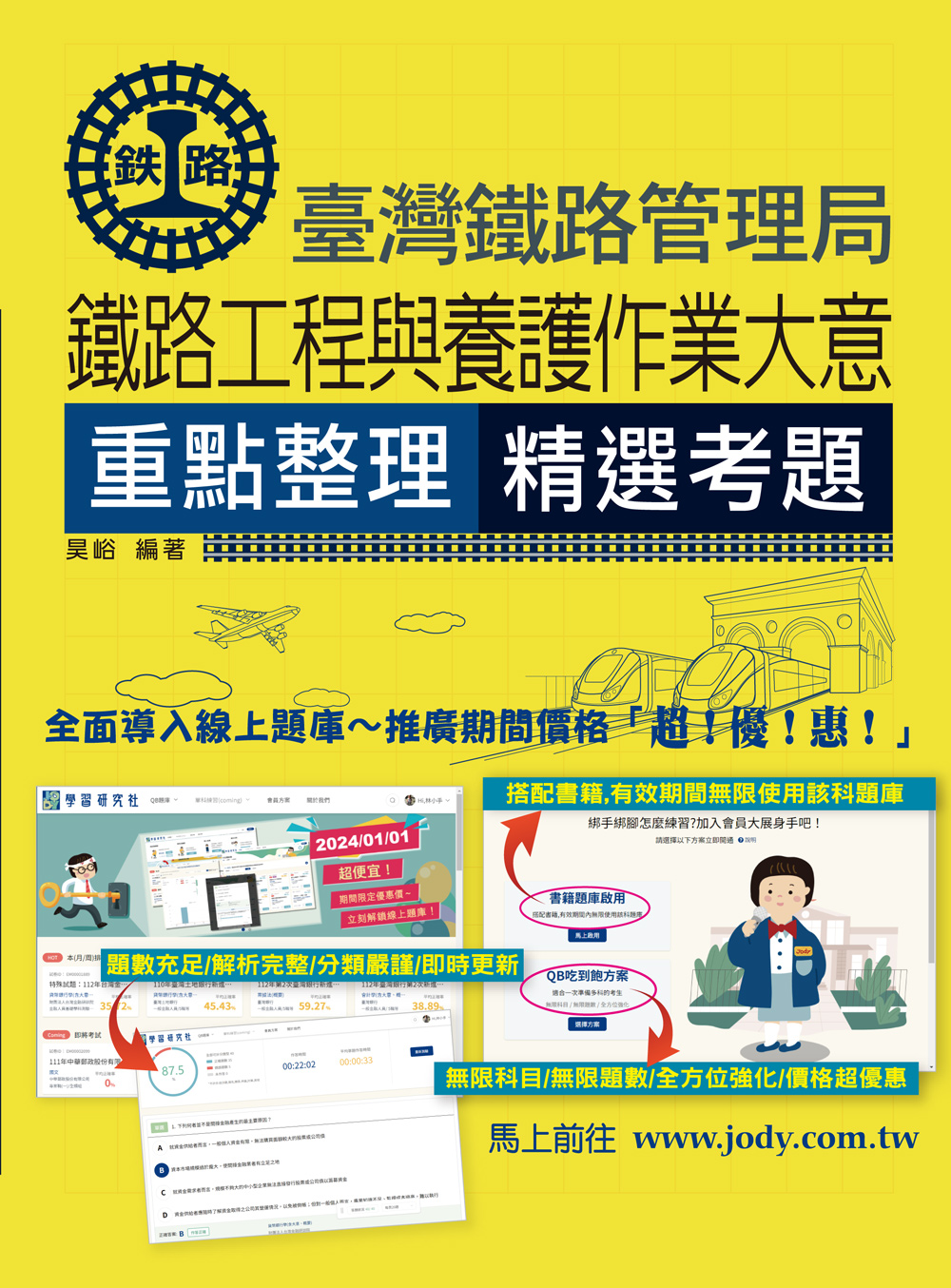 產品目錄 最新年度重點加強版重點一 運轉曲線、行車制度與保安裝置重點二 路線等級、路線測量與路線曲線、阻力重點三 鐵路軌道組成、養護與相關施工注意事項重點四 曲線超高建築界限加寬、車站與平交道、號誌重點五 軌道電路、供電系統與電車線相關安全規定重點六 建築界線與建築界線加寬交通部鐵道局「鐵路沿線施工安全作業標準」鐵路行車規則最新修正鐵路修建養護規則重點資訊第壹篇 鐵路工程大意第一章鐵路運輸概論重點一 基本名詞與定義重點二 鐵路設施與基本設計重點三 鐵路改革與我國鐵路事業特色重點四 平交道種類重點五 高速鐵路與輕軌運輸榜首練功房嚴選試題演練 第二章路線重點一 鐵路路線定義、選線原則與台灣鐵路建造史重點二 路線規格、路線容量與運轉曲線重點三 建築界限、車輛界限、月台界限與曲線界限重點四 軌道中心距離與線形榜首練功房嚴選試題演練 第三章軌道之管理與養護重點一 鐵路軌道構造重點二 鋼軌、枕木、長軌、無道碴軌道與軌道力學概念重點三 路基與道碴重點四 軌道配件及防護設備重點五 道岔(turnout)重點六 軌道之養護榜首練功房嚴選試題演練 第四章車輛、列車動力與車站、調車場重點一 車輛重點二 列車動力(阻力、牽引力及緊軔)重點三 車站與調車場榜首練功房嚴選試題演練 第五章保安裝置、行車制度及供電系統重點一 保安裝置重點二 行車制度重點三 供電系統榜首練功房嚴選試題演練 第貳篇 鐵路養護作業大意鐵路修建養護規則條文解析重點一 總則重點二 鐵路修建重點三 鐵路路線之養護重點四 高速鐵路修建重點五 高速鐵路養護榜首練功房嚴選試題演練附錄 最新法規修正資訊暨相關法規重點摘要鐵路法(節錄)1067公厘軌距軌道橋隧檢查養護規範1067公厘軌距鐵路長焊鋼軌鋪設及養護規則1435公厘軌距鐵路長銲鋼軌舖設及養護規範鐵路立體交叉及平交道防護設施設置標準與費用分擔規則(節錄)鐵路路線測量規則(節錄)鐵路專用側線修建及使用規則(節錄)鐵路兩側禁建限建辦法鐵路機車車輛檢修規則高速鐵路建設技術標準規範(節錄)高速鐵路車輛技術標準規範 鐵路行車規則臺灣鐵路管理局軌道標誌設置規則特別補充 臨近電化鐵路設施防護辦法距軌道中心之防護沿鐵路與跨軌之防護臨近鐵路與跨越鐵路之人行天橋、公路之防護榜首練功房嚴選試題演練鐵路人員考試試題113年公務人員特種考試交通事業鐵路人員考試試題100~112年公務人員特種考試交通事業鐵路人員考試試題與解析限期線上看