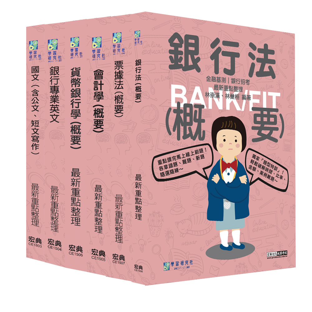 產品目錄 金融基測/銀行招考專用套書,內含:(1). 銀行招考國文(測驗題型);(2). 銀行專業英文;(3). 會計學(概要);(4). 貨幣銀行學(概要);(5). 票據法(概要);(6). 銀行法(概要)。