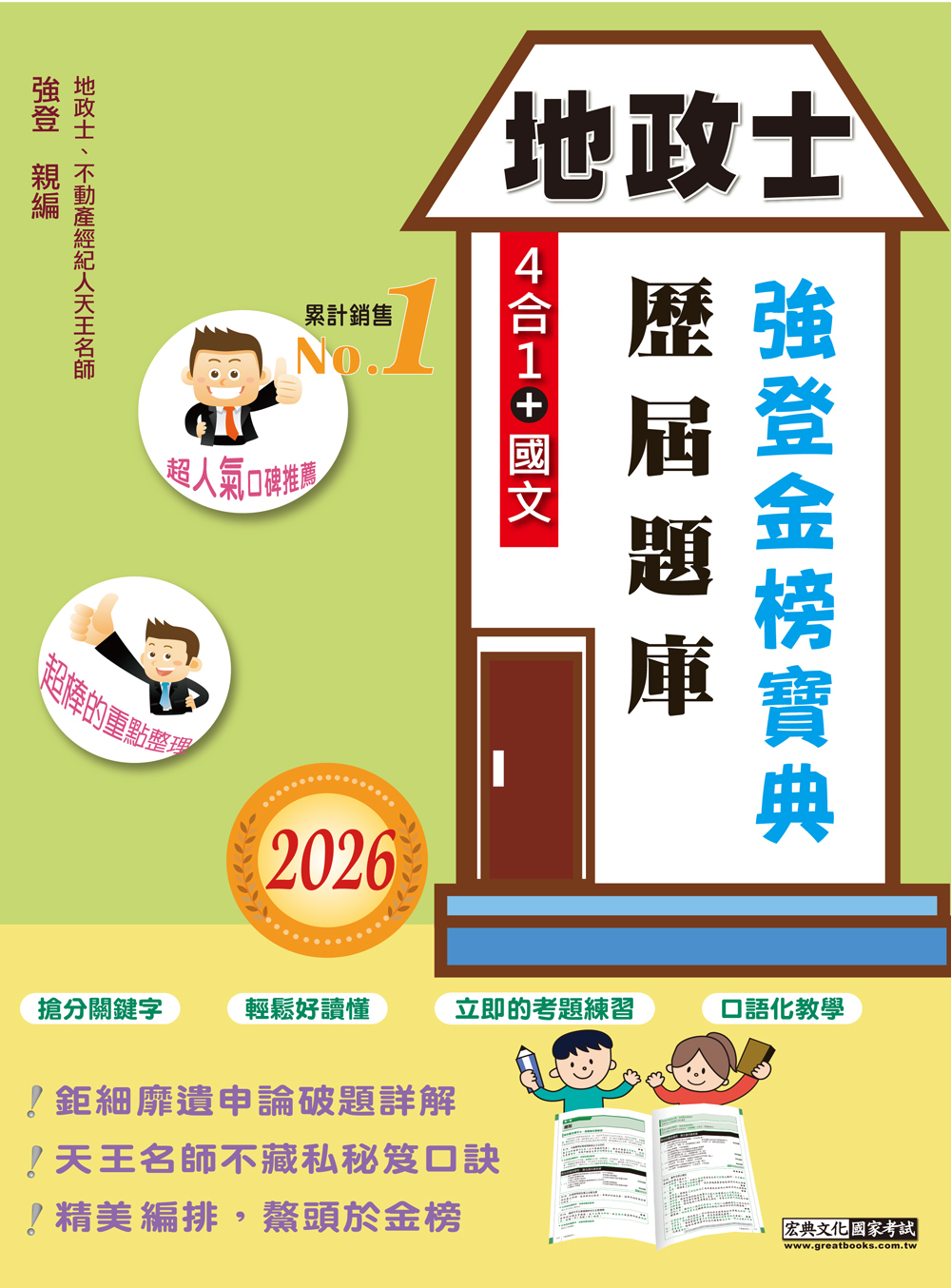 商品描述 | 強登金榜寶典: 歷屆題庫專業科目四合一+國文 (2026年全新改版 地政士):★天王名師不藏私破解答題秘訣+搶分關鍵字完整傳授★PTT上榜考生實際使用上榜推薦:我選了一本很多 |