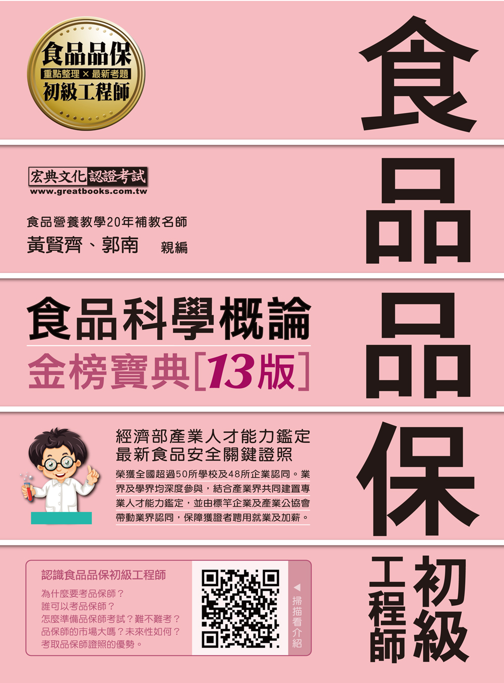 內容簡介 ★增修訂第十三版全新發行★考生注意!準備食品品保初級工程師考試,備考用書當然指名「黃賢齊」老師專業教材。自第1屆考試起即時時緊盯命題方向與最新修法,四大優勢帶您一窺品保工程師考試的全貌:1. 內容最豐富:各章節命題重點細說分明,為求徹底理解更貼心提供「補充說明」與「Q&A」單元,拒絕「有看沒有懂」浪費時間;2. 法令修訂更新:配合近期新增/修訂食品法規更新全書內容;3. 試題數最多:除完整收錄歷屆試題、官方樣題外,更輔以模擬試題演練,大量考題考前多練習有寫有分數;4. 圖文並茂增進理解:拒絕只有枯燥無味的文字敘述,大量利用各種整理表、流程圖輔助考生學習,將備考效率提升到最高。 第13版改版要點: 食品為生物之檢驗方法_阪崎腸桿菌之檢驗 (113.8.27) 食品保存_熱殺菌密閉容器包裝食品(罐頭食品) 113年第2次、114年第1次食品品保初級工程師能力鑑定試 題暨解析 經濟部產業人才能力鑑定最夯食安證照「食品品保工程師」:由經濟部核發能力鑑定證書,並促進企業優先面試 聘用及加薪獲證者。考取最具公信力之食品品保證照,不僅提升自我價值,更是您投身知名業界及職場的基本入場卷-「含金量」甚高;強烈建議相關科系同學/從業人員盡早考取,先考先贏! 經濟部為充裕產業升級轉型所需人才,於105年起專案推動產業人才能力鑑定業務,整合產官學研共同能量,建立能力鑑定體制及擴大辦理考試項目,由經濟部核發能力鑑定證書,並促進企業優先面試 聘用及加薪獲證者。 爰此,因應國內食品產業發展趨勢人才需要,策劃產業人才之能力鑑定制度,期有效引導學校或培訓機構因應產業需求規劃課程,以輔導學生就業縮短學用落差,同時鼓勵我國在校學生及相關領域從業人員報考,引導民間機構投入培訓產業,以訓考用循環模式培養符合產業及企業升級轉型所需人才並提供企業選用優秀關鍵人才之客觀參考依據,以提升食品產業人才之素質與競爭力。民以食為天,食品安全問題層出不窮。人們冀望吃到安心的食品,對健康的關注與日遽增。保健食品亦備受關注,105年5月首度舉辦第一次品保食品初級工程師。吾人立即成班授課,期望幫助學員順利考上。在課務繁忙之際,曹總經理盛情邀約鼓勵出版此書,期望與更多的同學分享。感謝曹總知遇之恩及出版社同仁的投入及辛勞。也感謝家人的鼓勵及包容。除了感謝,還有感恩!