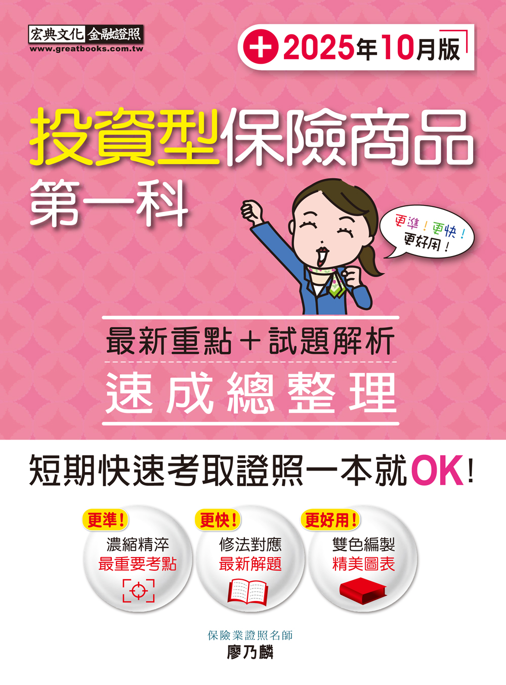 | 書名 / | 投資型保險商品第一科速成總整理: 最新重點+試題解析 (2025年10月版) |